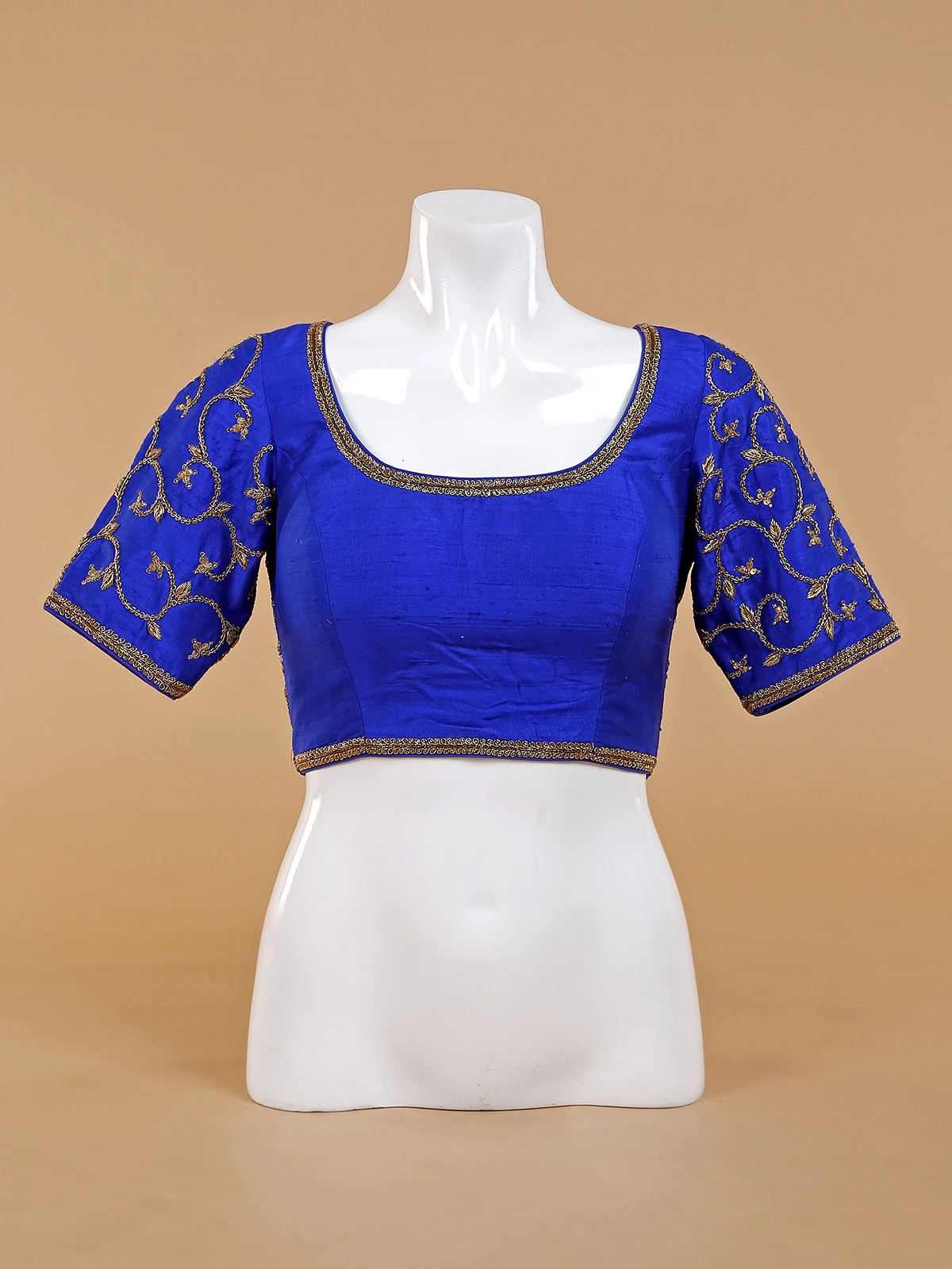 Buy this trendy blue raw silk blouse to get ready for any event. Enhanced with zardosi and sequins work, features a U neck and half sleeves.