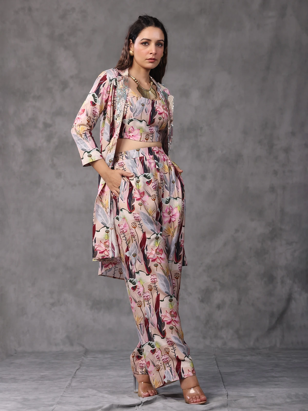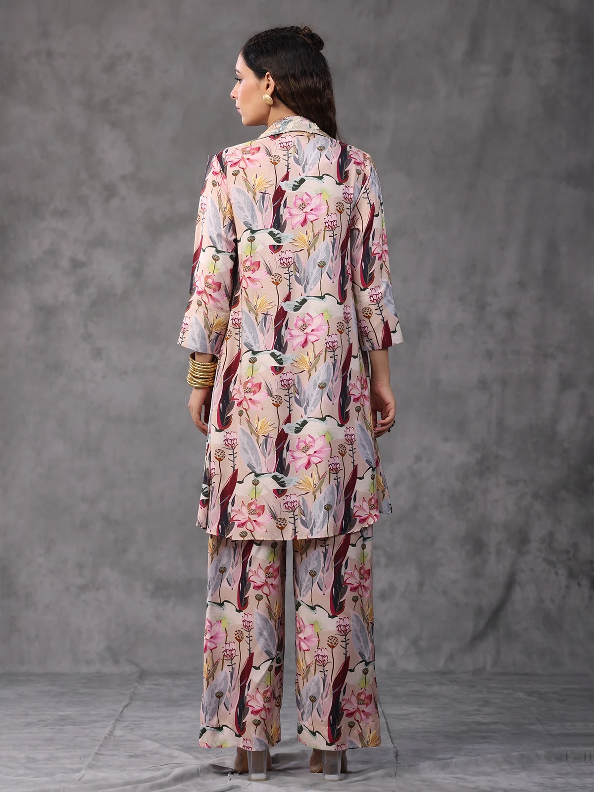 Stand out with the pink floral printed jacket style co ord set. Tailored in viscose muslin fabric with sequins work and it is complemented by a bottom and jacket.