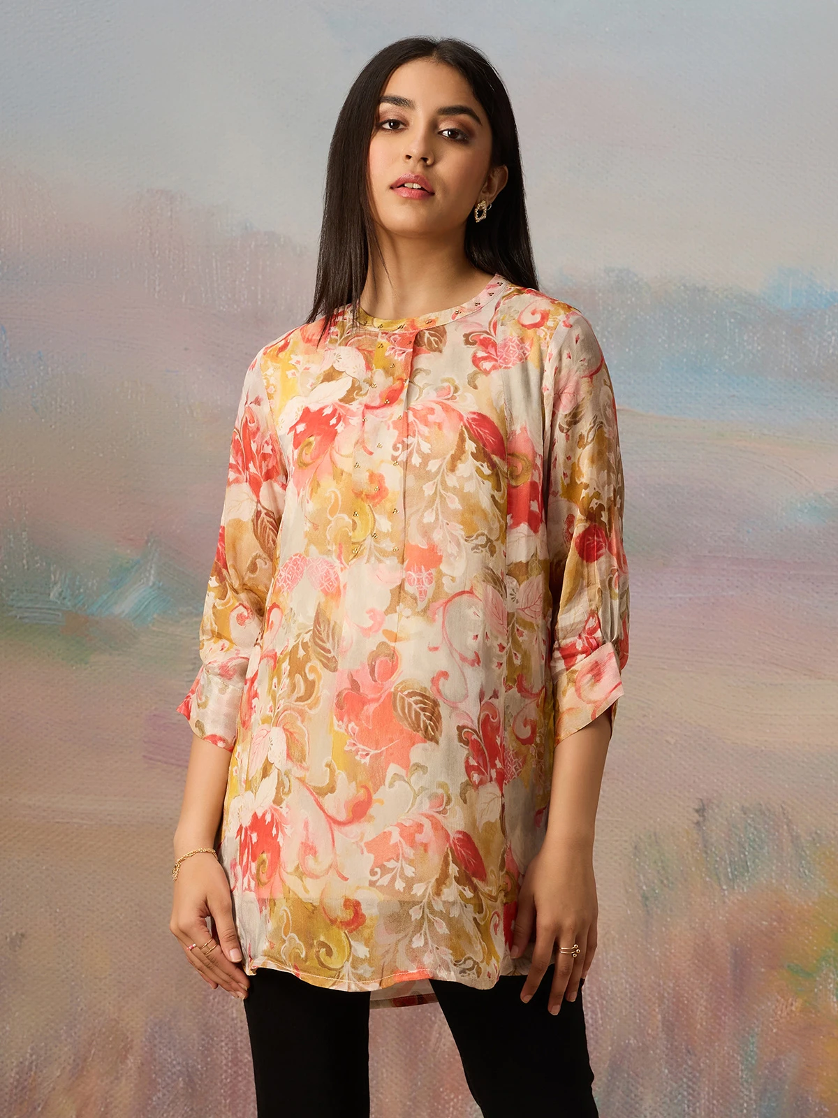 Enhance your casual look with this beige silk printed tunic top. It provides a chic cool and comfortable look with round neck and quarter sleeves.