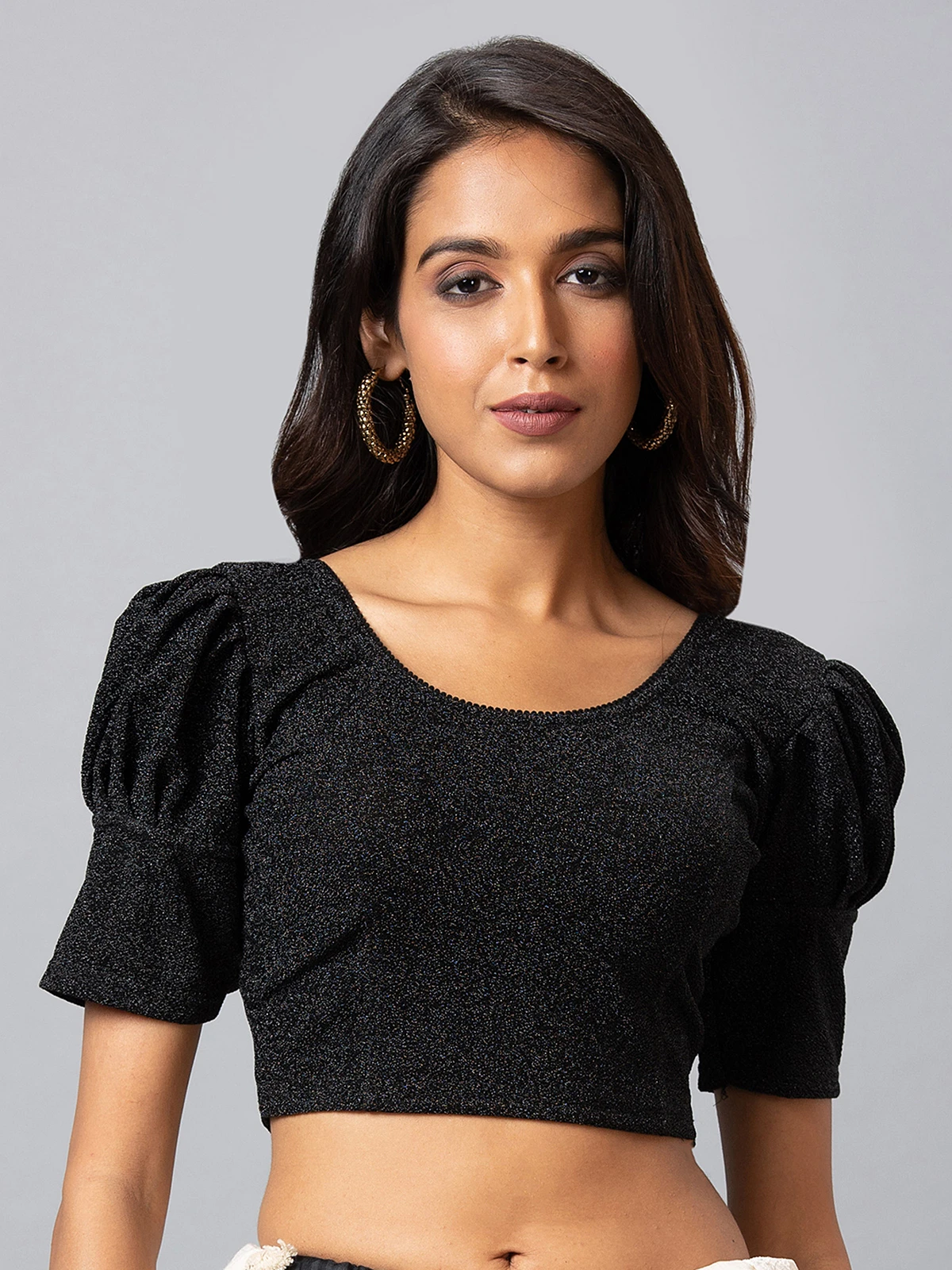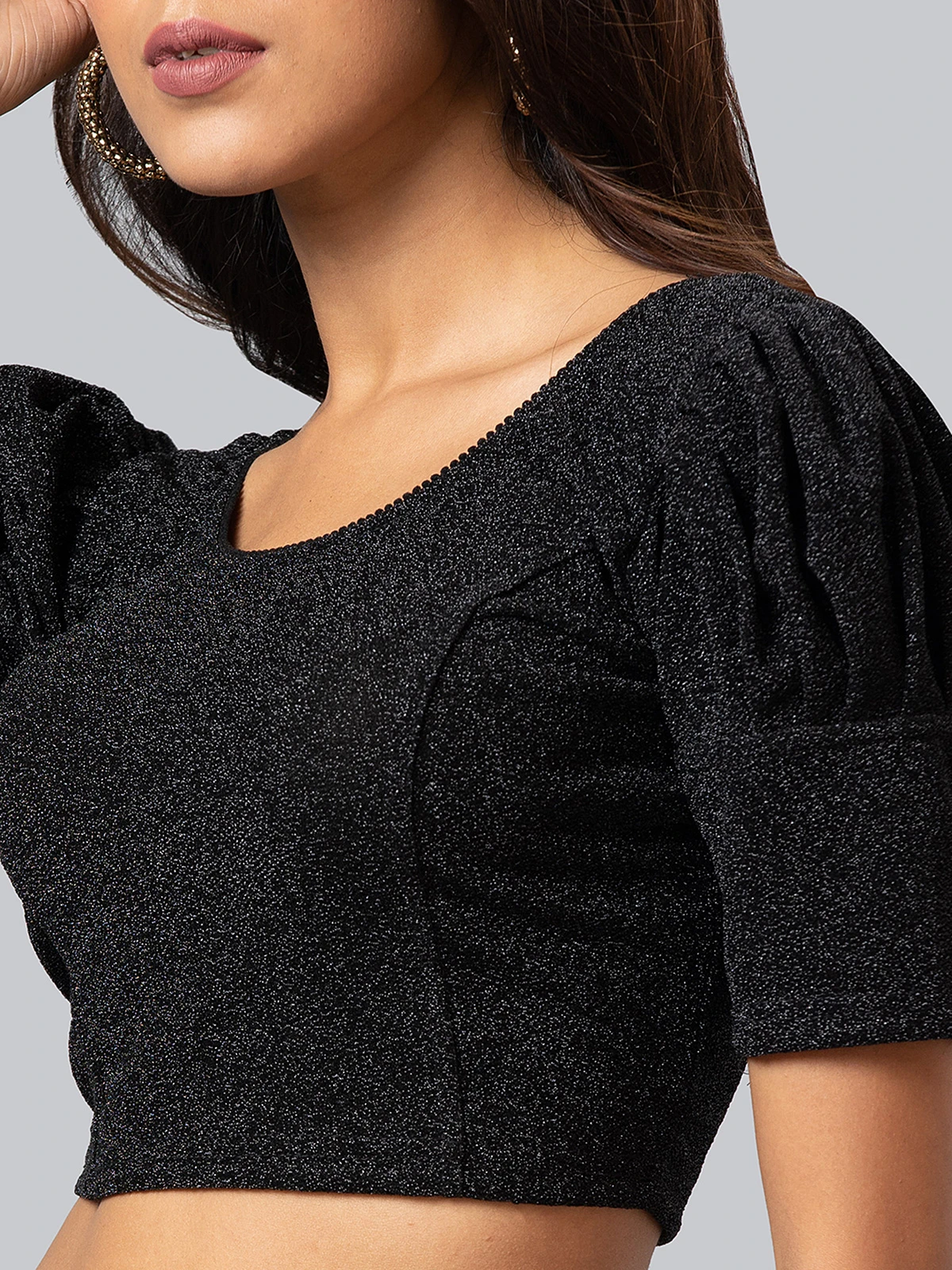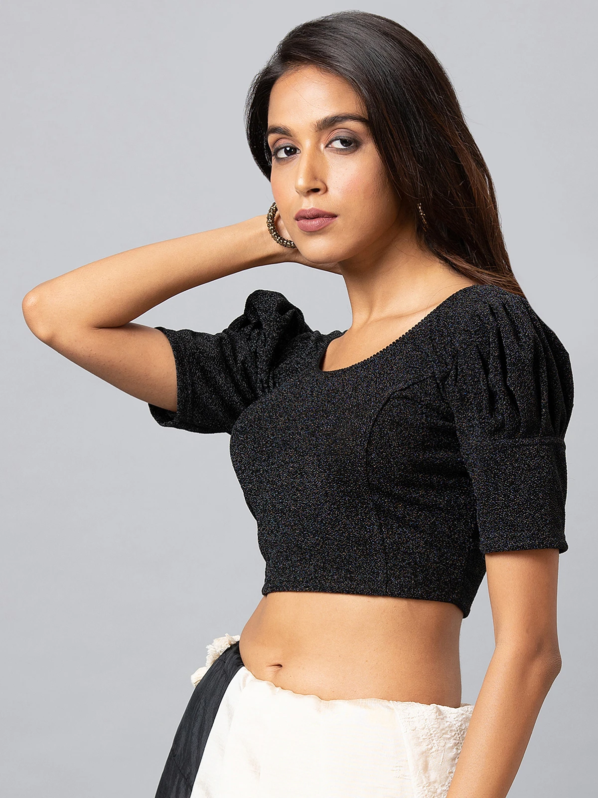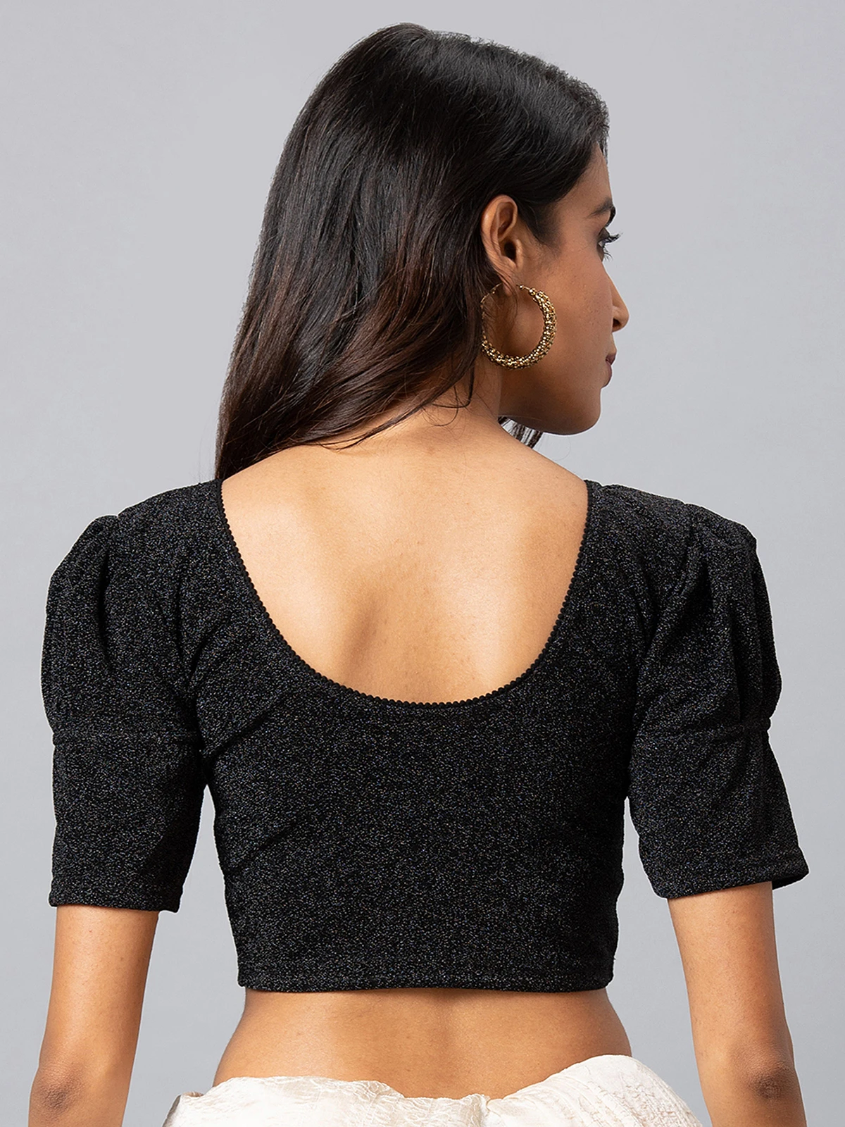 This black lycra cotton self design blouse. It has a round neck and half sleeves, gives its a very refreshing and classic feel.