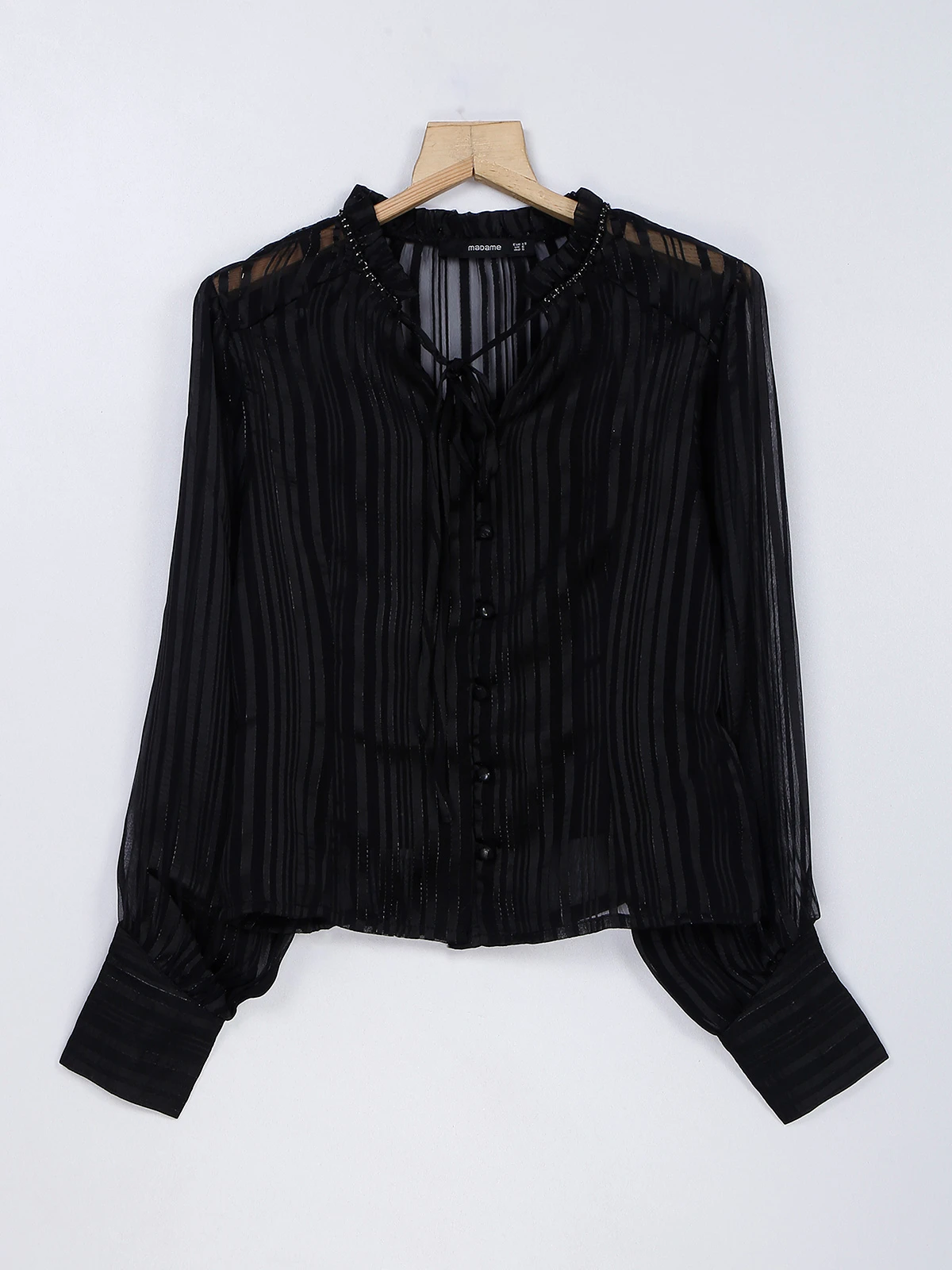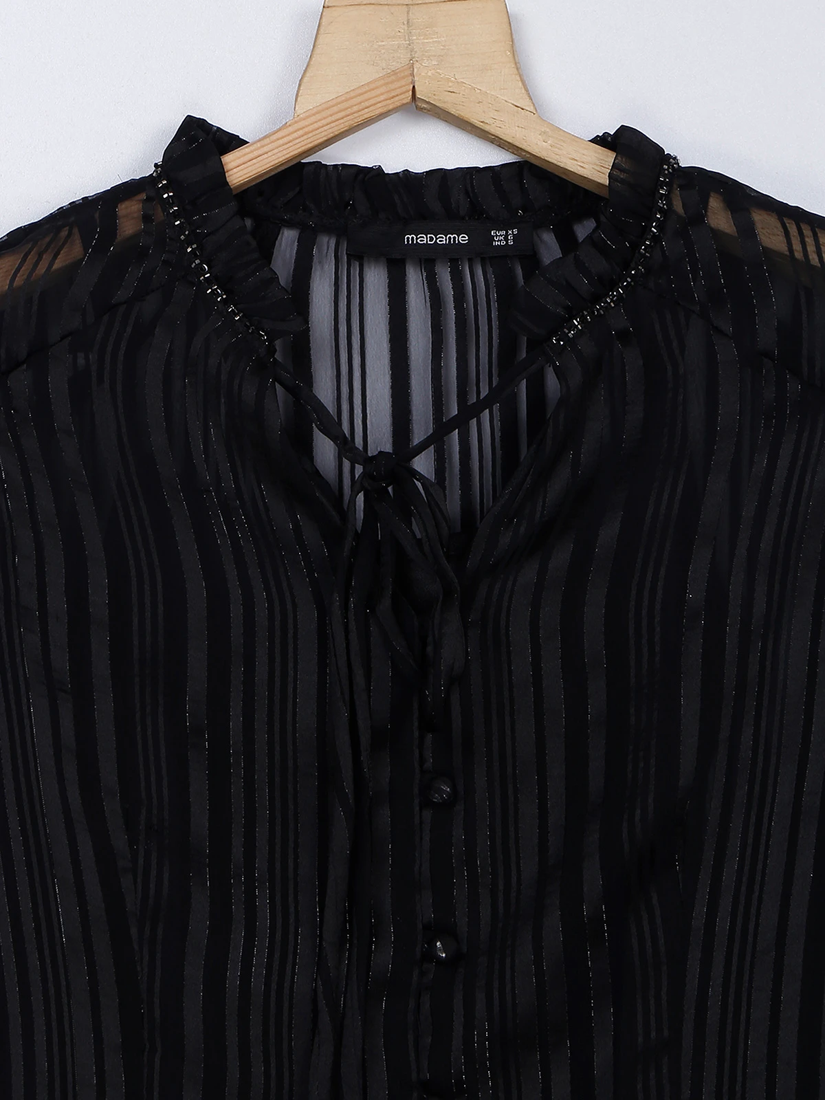 Fabricated in chiffon, this black top ensures durable and soft wear. This stripe top comes tailored to a slim fit and features a keyhole neck and full sleeves for a modern silhouette and appeal.
