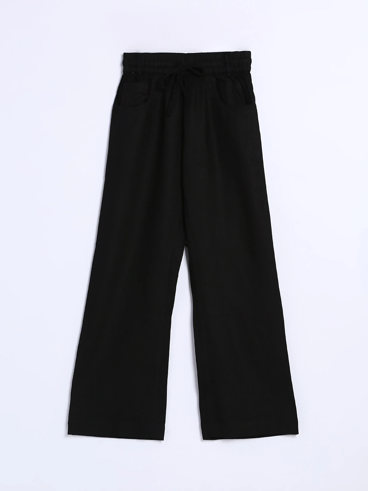 Versatile plain flare pant offered in a black tone from Boom, this pant has an elasticated waistband with drawstring, two scoop pockets on the front, two patch pockets on the back. and offers a chic modern silhouette.