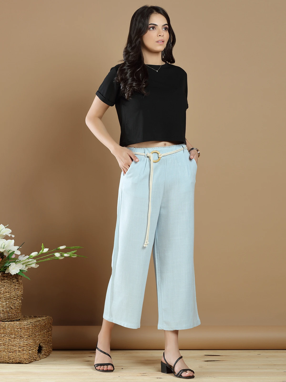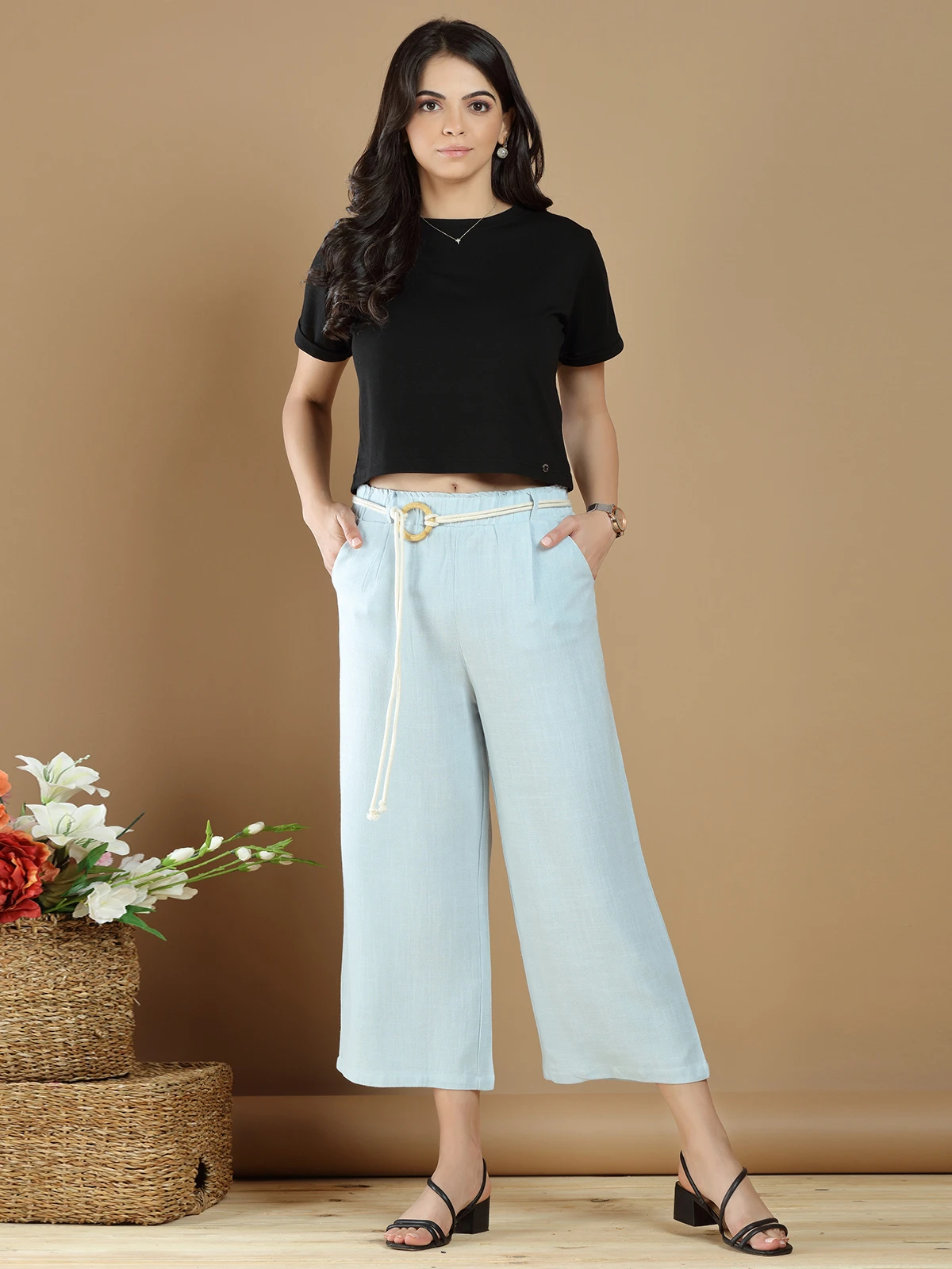 Enjoy casual get together with this linen casual wear ankle length pant in powder blue. Slant pocket at front both side.