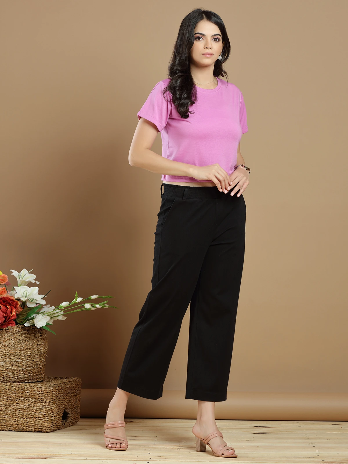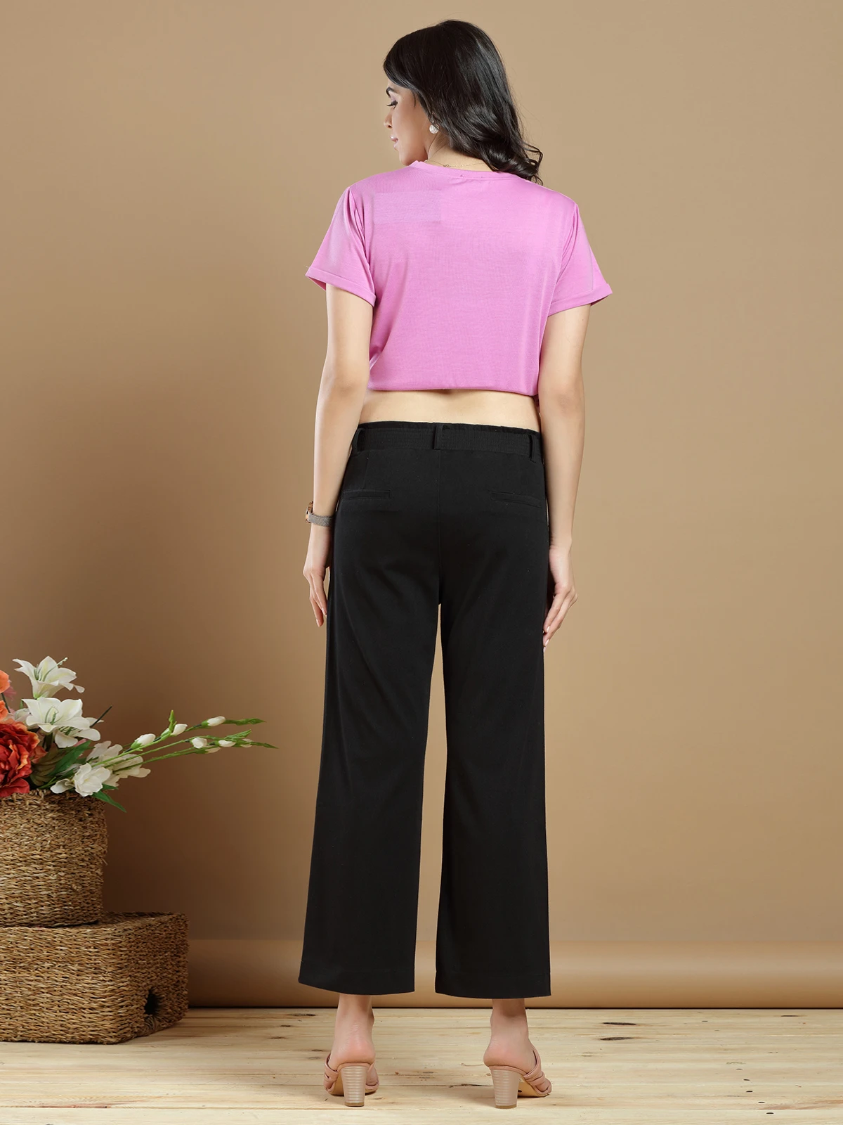 Give yourself a stylish look in this black cotton plain palazzo pant, features with slant pocket at front both side, welt pocket at back side, waist band and belt loops, ankle length.