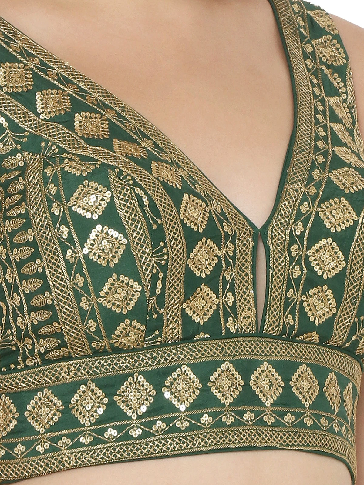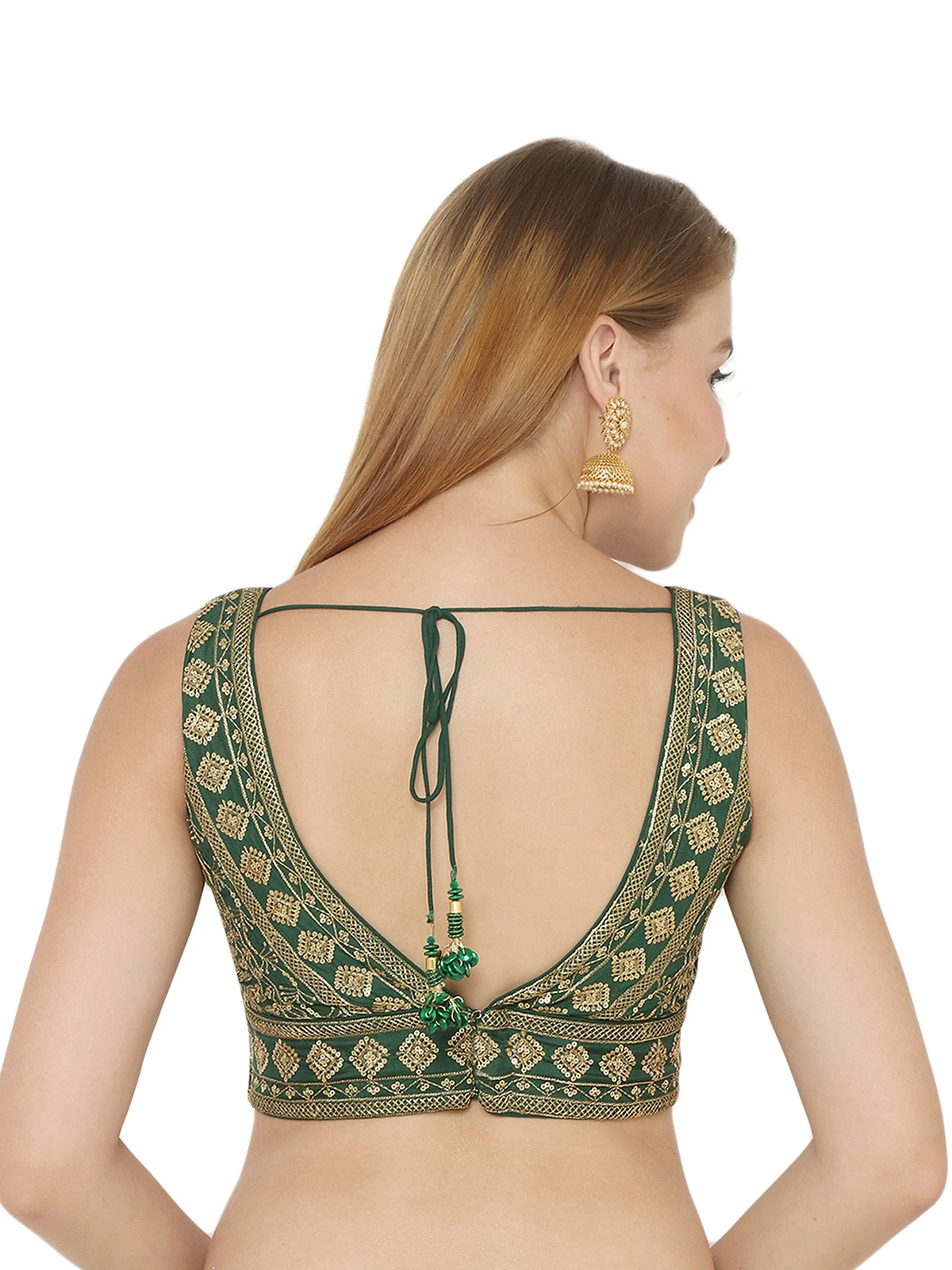 Add this stunning dark green silk blouse in your ethnic collection. Crafted with the finest embroidery work, features a V neck, sleeveless pattern and back open closure.