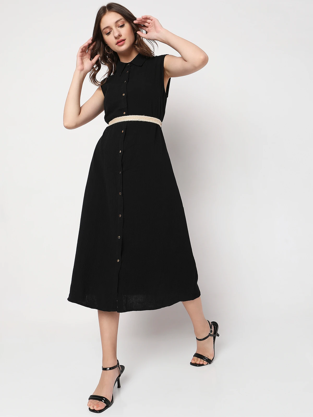 Turns heads wherever you go with this beautiful black shirt style dress from Deal. Made with the finest cotton material, the plain dress features a collar neck and sleeveless pattern.
