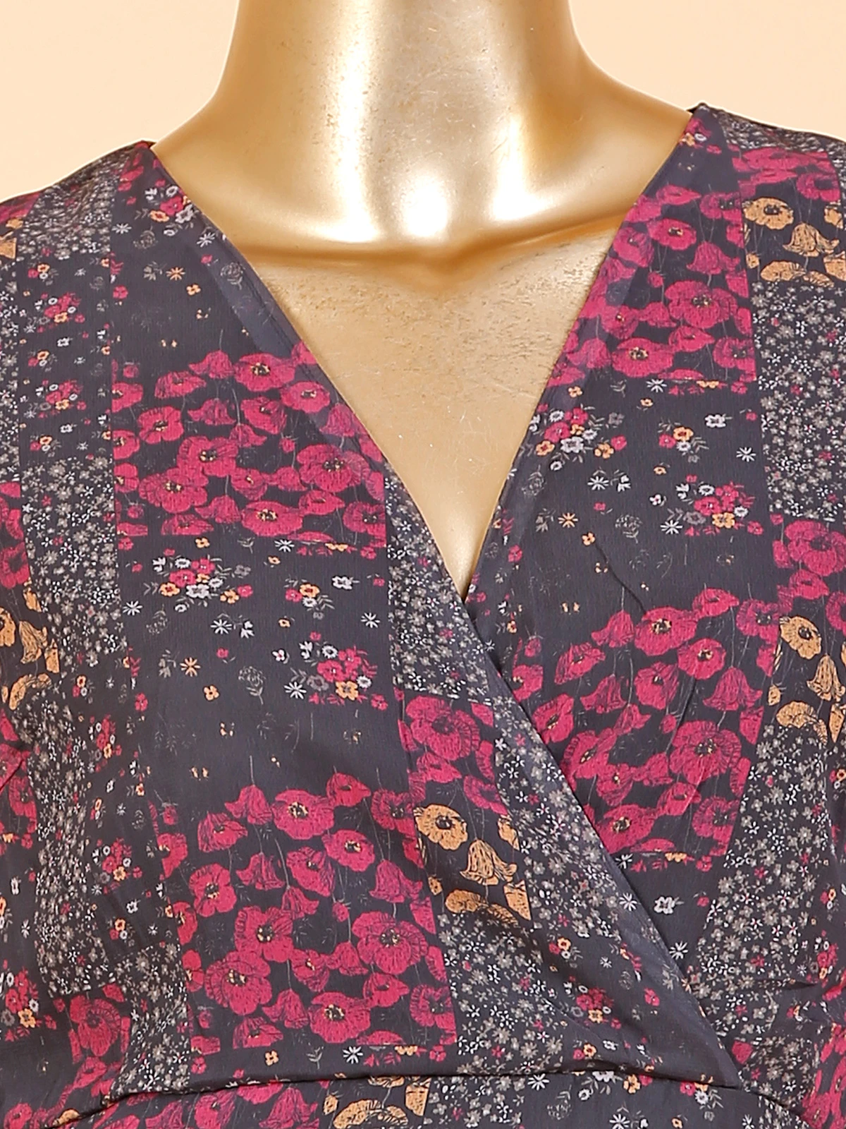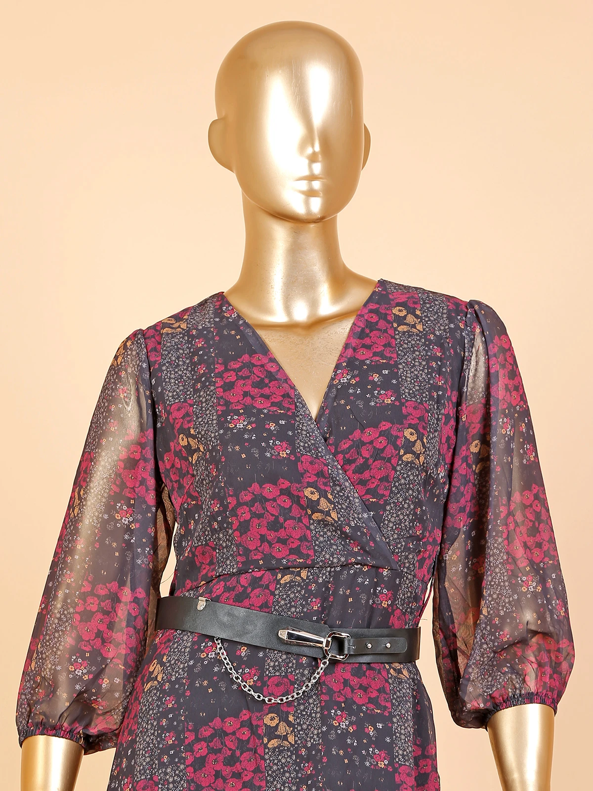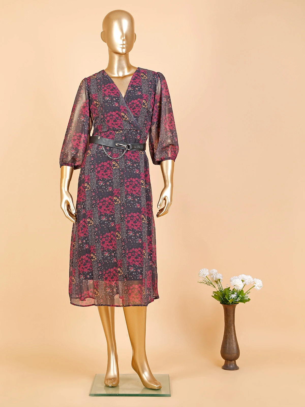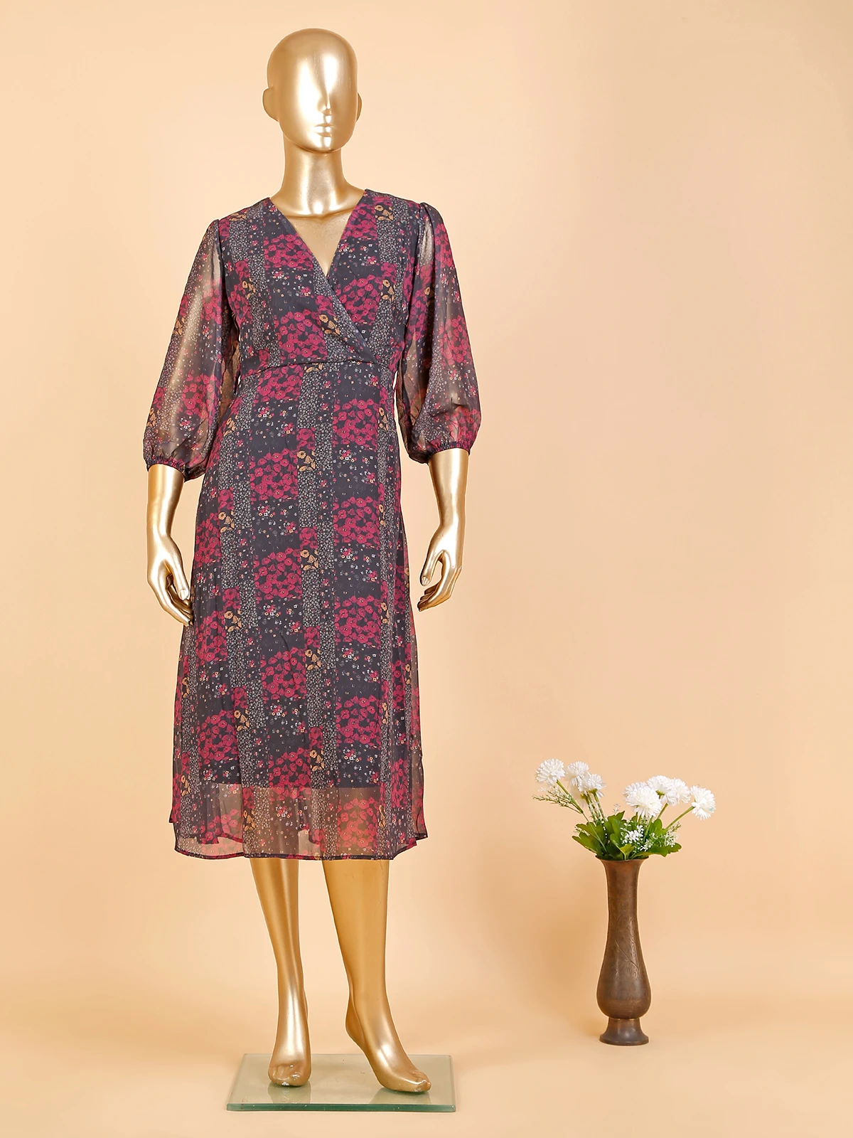 This black printed dress from Deal designed with a V neck and quarter sleeves, this organza dress comes cut to a relaxed fit for seamless and comfortable wear.