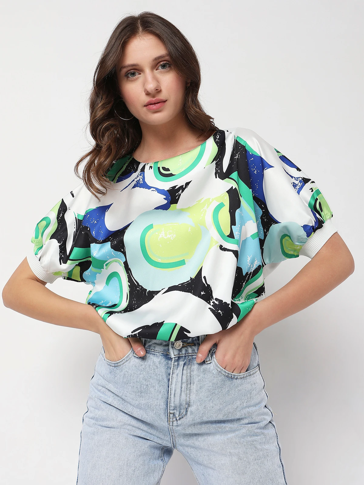 This green printed crepe top from Deal is designed with round neck and half sleeves.