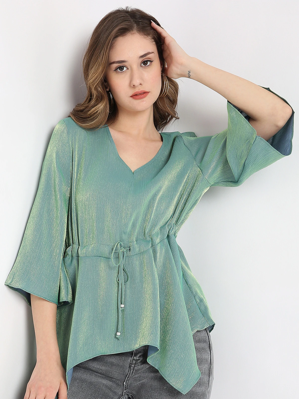 Maximize your comfort and style with this green shaded lycra top from Deal has V neckline and quarter sleeves to give you a comfortable wear.