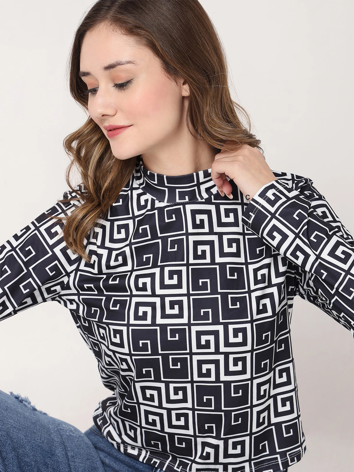 The Deal navy printed top is construction in cotton that ensure you remain trendy while being comfortable. It features a bandgala neck and full sleeves that adds to its style element.