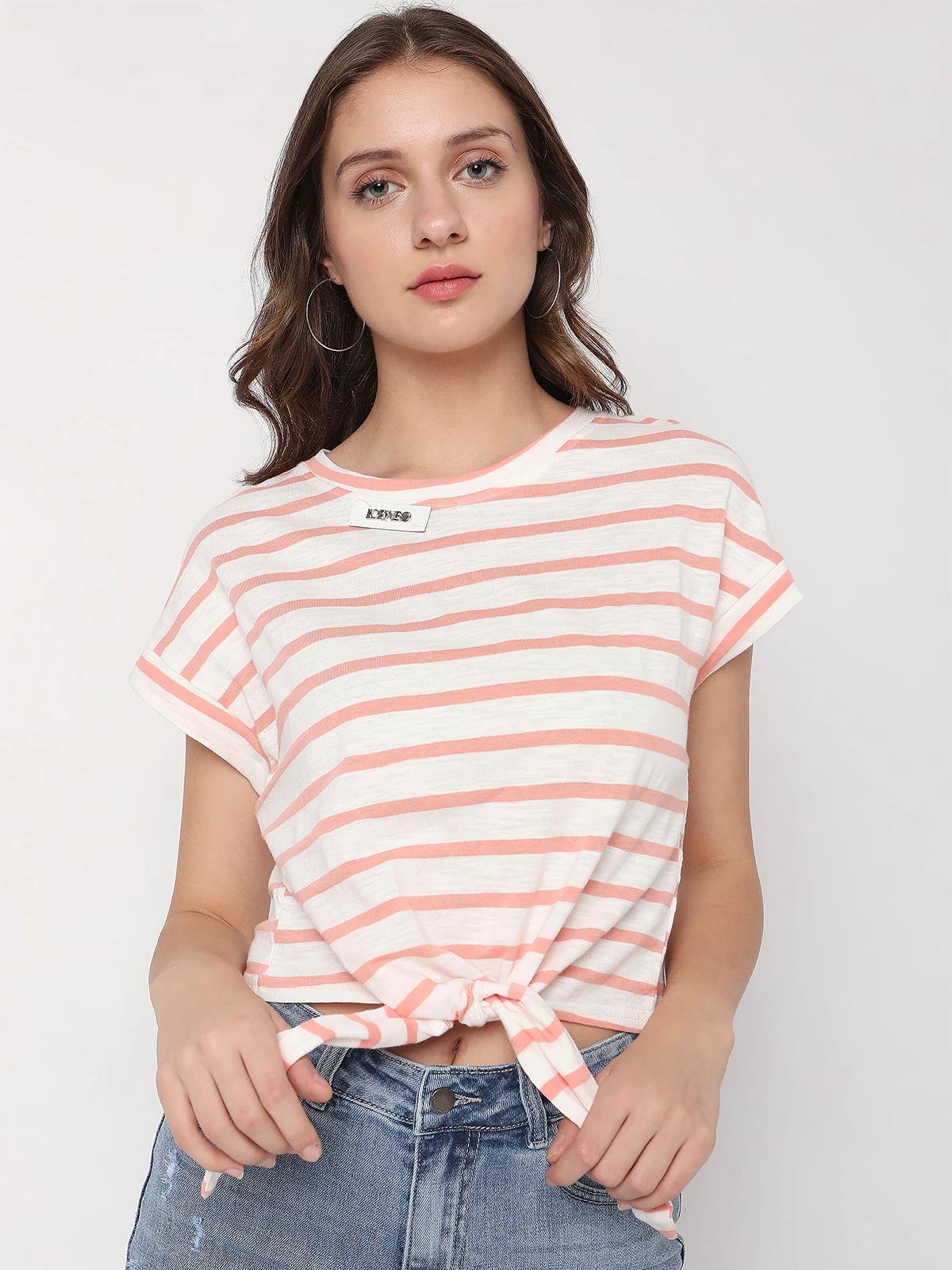 This Deal peach cotton stripe pattern top will add versatility to your wardrobe. It has a round neck to stay comfy.