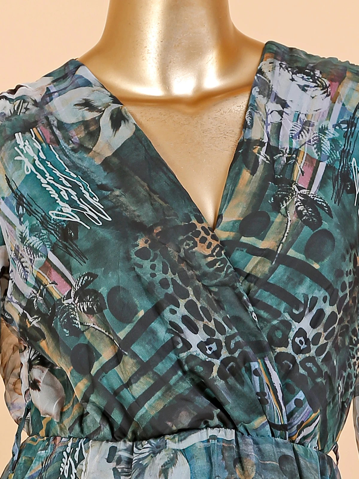 Create a bold look as you wear this Deal sea green printed dress is going to be your next casual outing. Crafted using organza material with V neck and quarter sleeves.