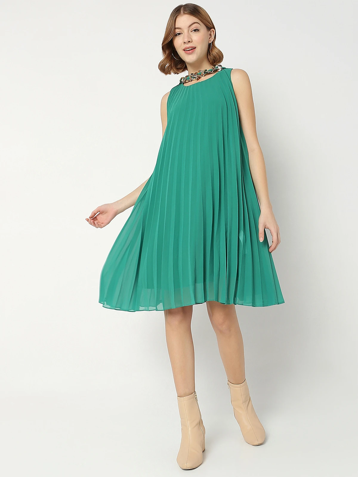 Deal brings you a beautiful teal green plain dress that gives you a comfortable and gorgeous look. This product is made from georgette. It features sleeveless pattern and a round neck. Perfect for your everyday uses.