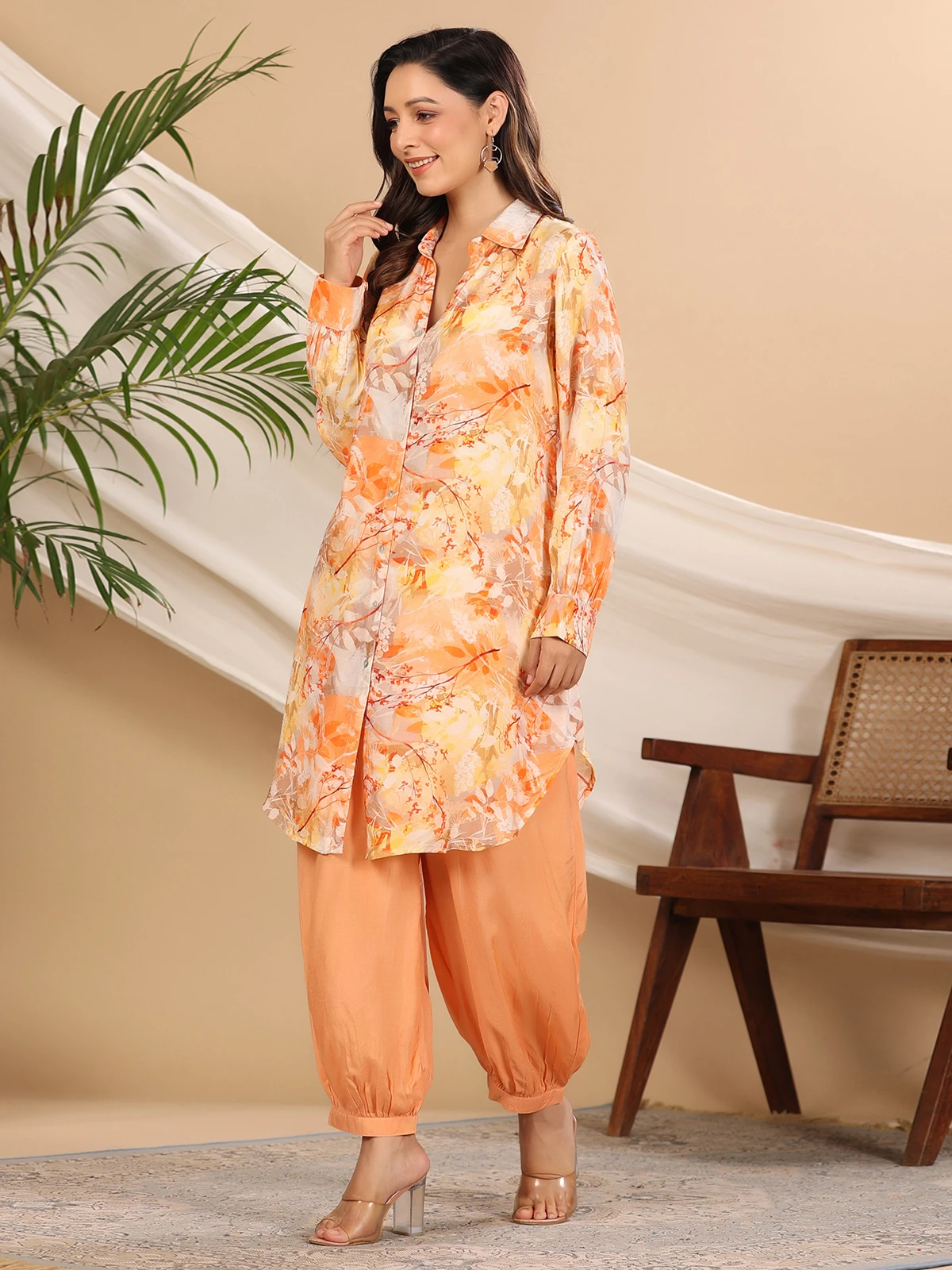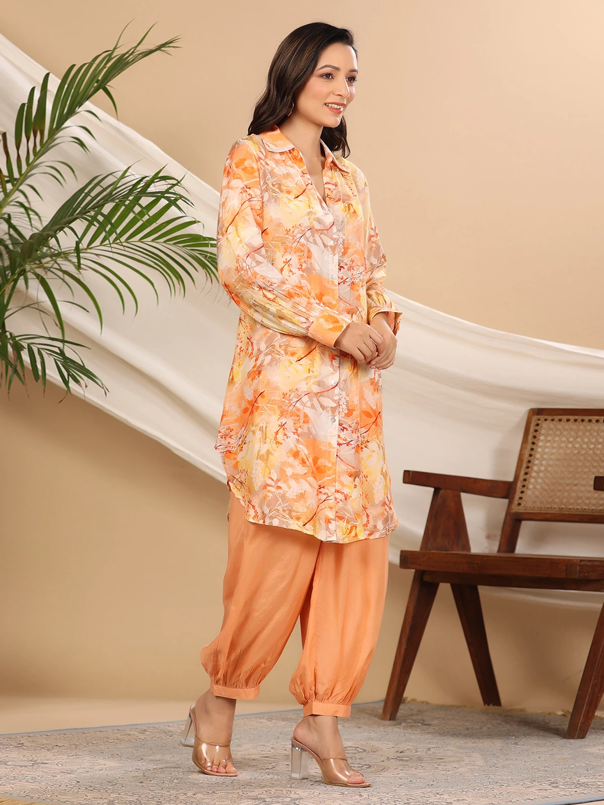 A great combination of comfort and style, this peach silk printed co ord set can be a versatile addition to your wardrobe. The collar neck and full sleeves will surely make you look gorgeous.