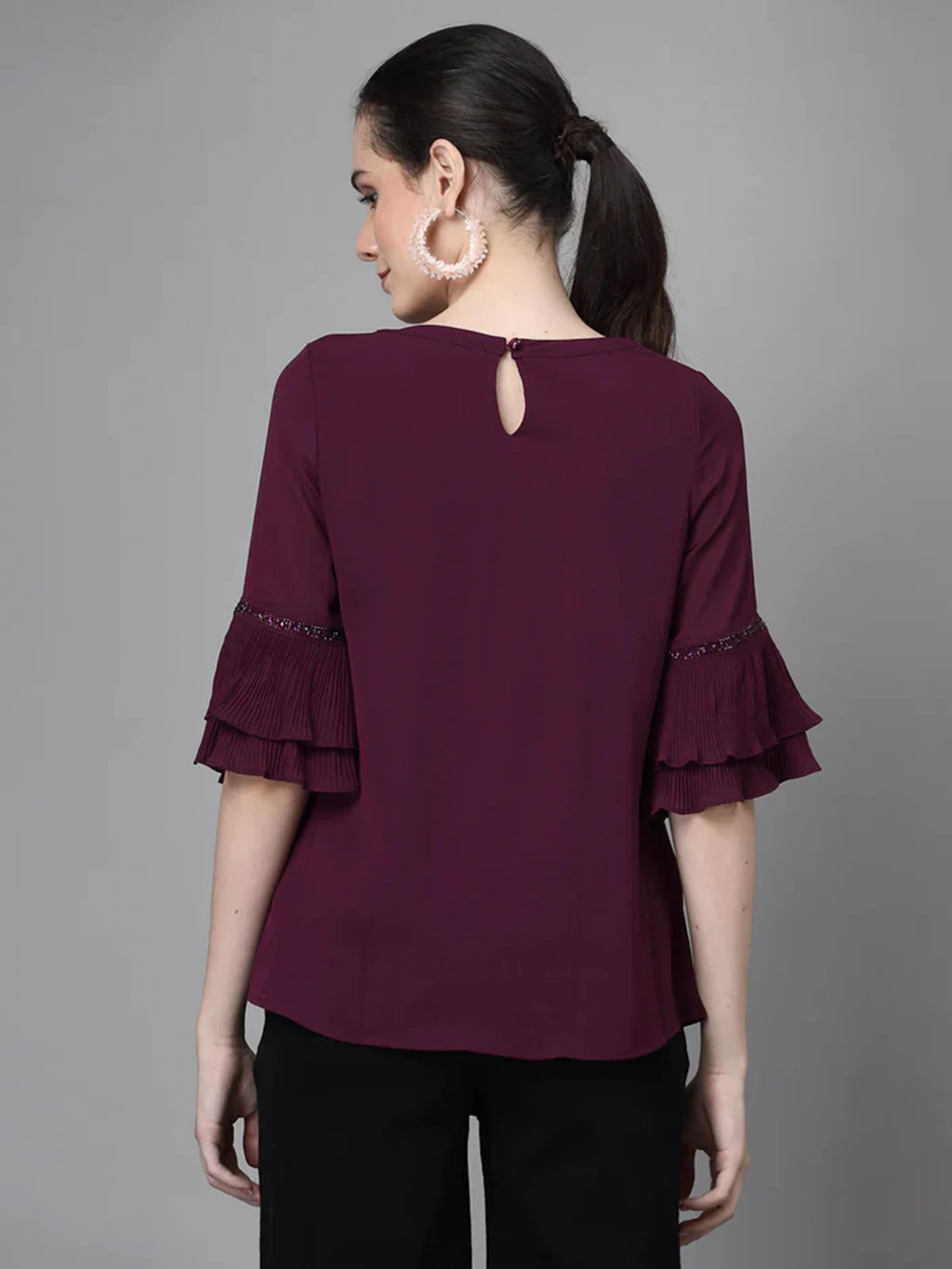Update your casual top collection with this cool and comfy purple georgette top from Global Republic. It has a round neck and quarter bell sleeves for a classy look.