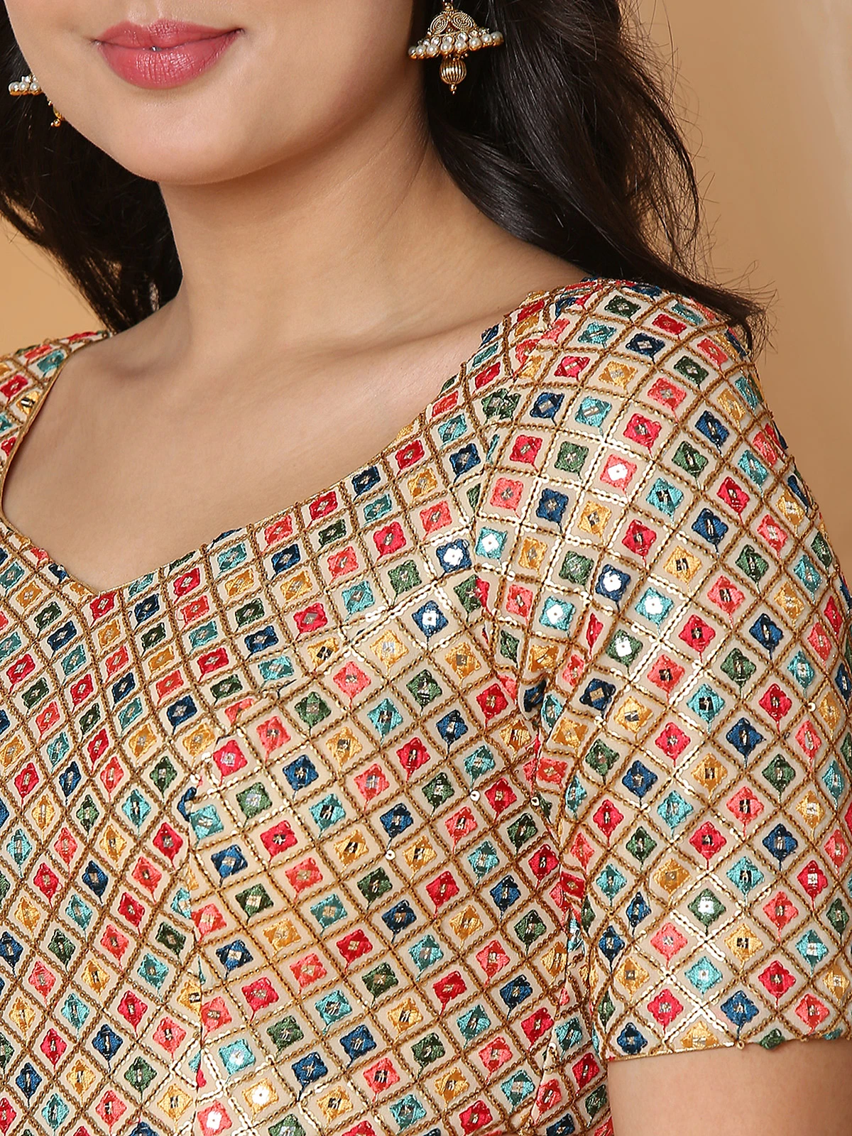 Attractive gold color georgette blouse, crafted with embroidery work. Features a sweetheart neck, back hook closure and elbow slevees.