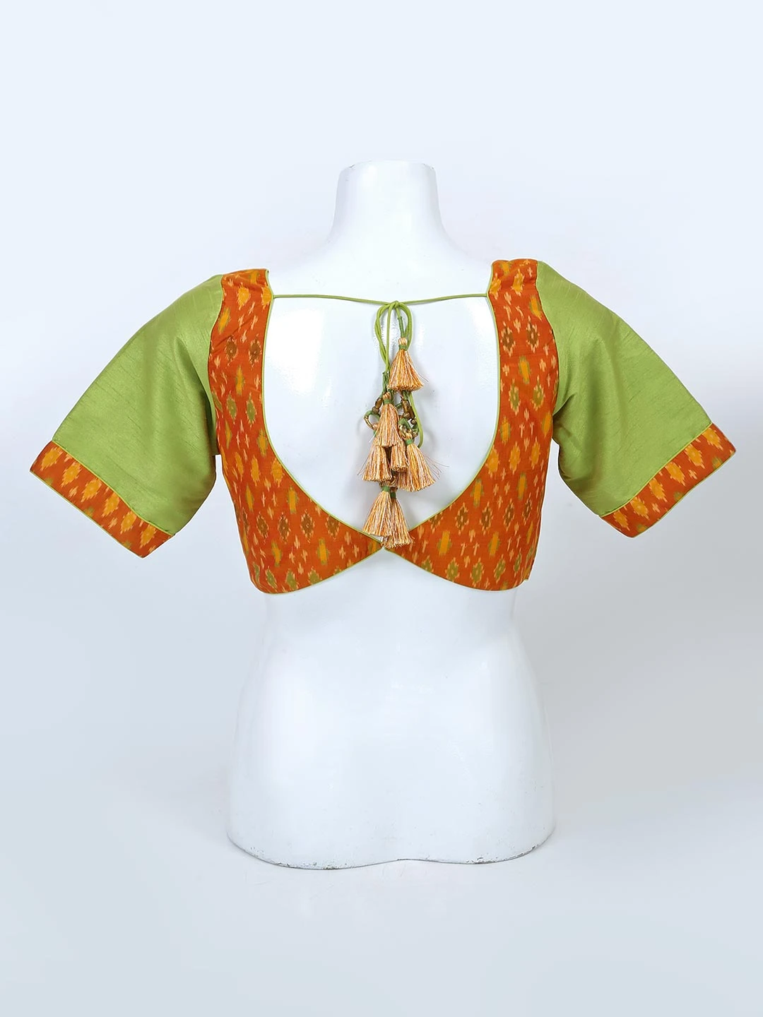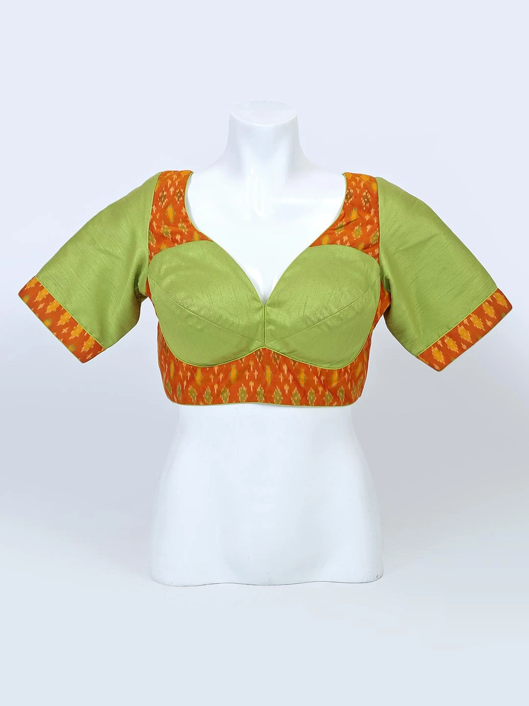 Comfortable and stylish green designer readymade blouse piece. Its come with a sweetheart and a half sleevees.