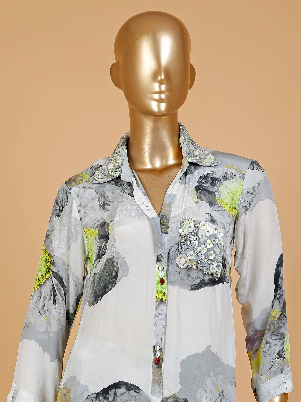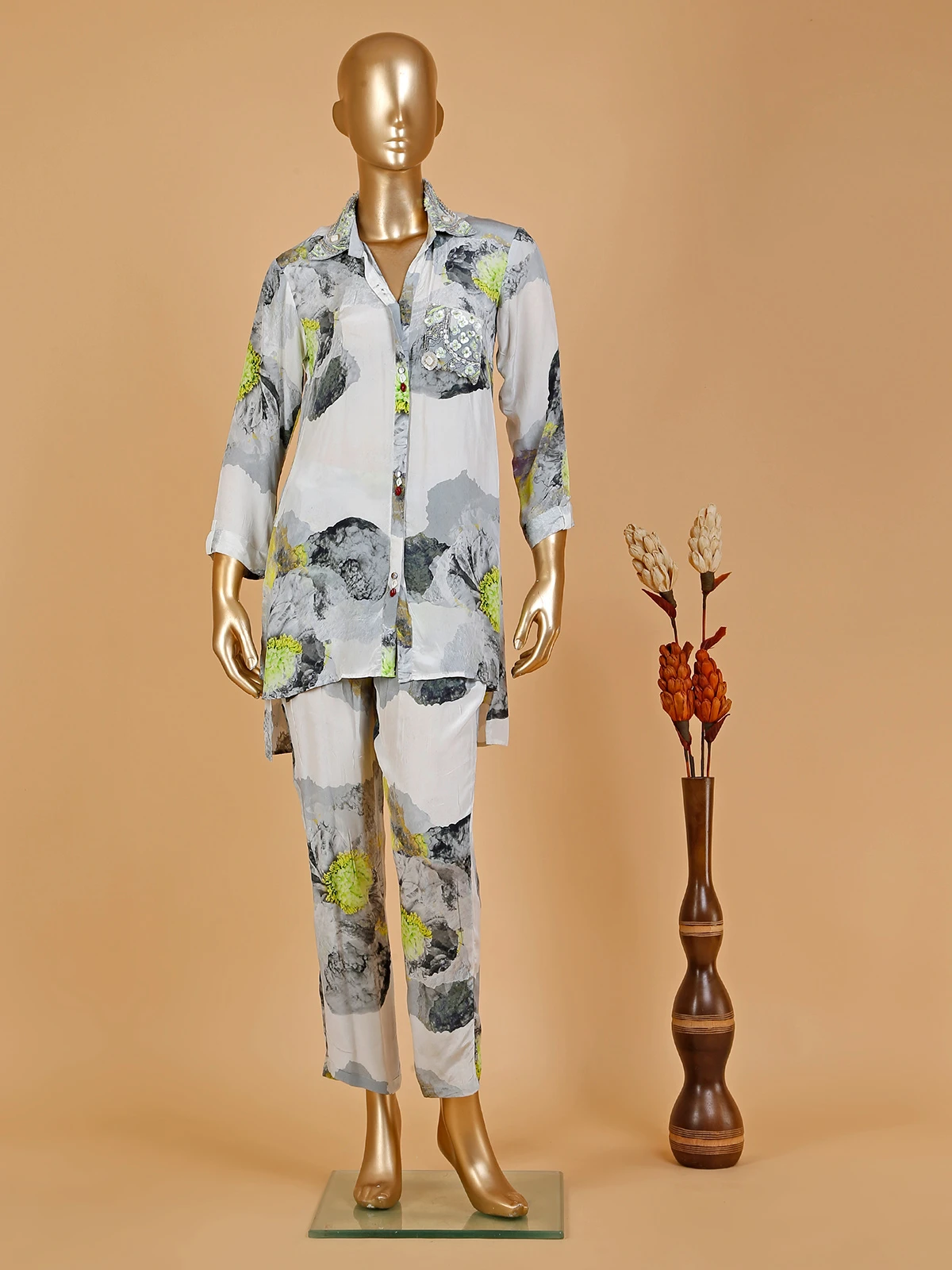 Indulge in style and grace with this captivating grey and green silk co ord set. The printed design, collar neck and quarter sleeves pattern combine to create a mesmerizing ensemble that is a must have in your wardrobe.