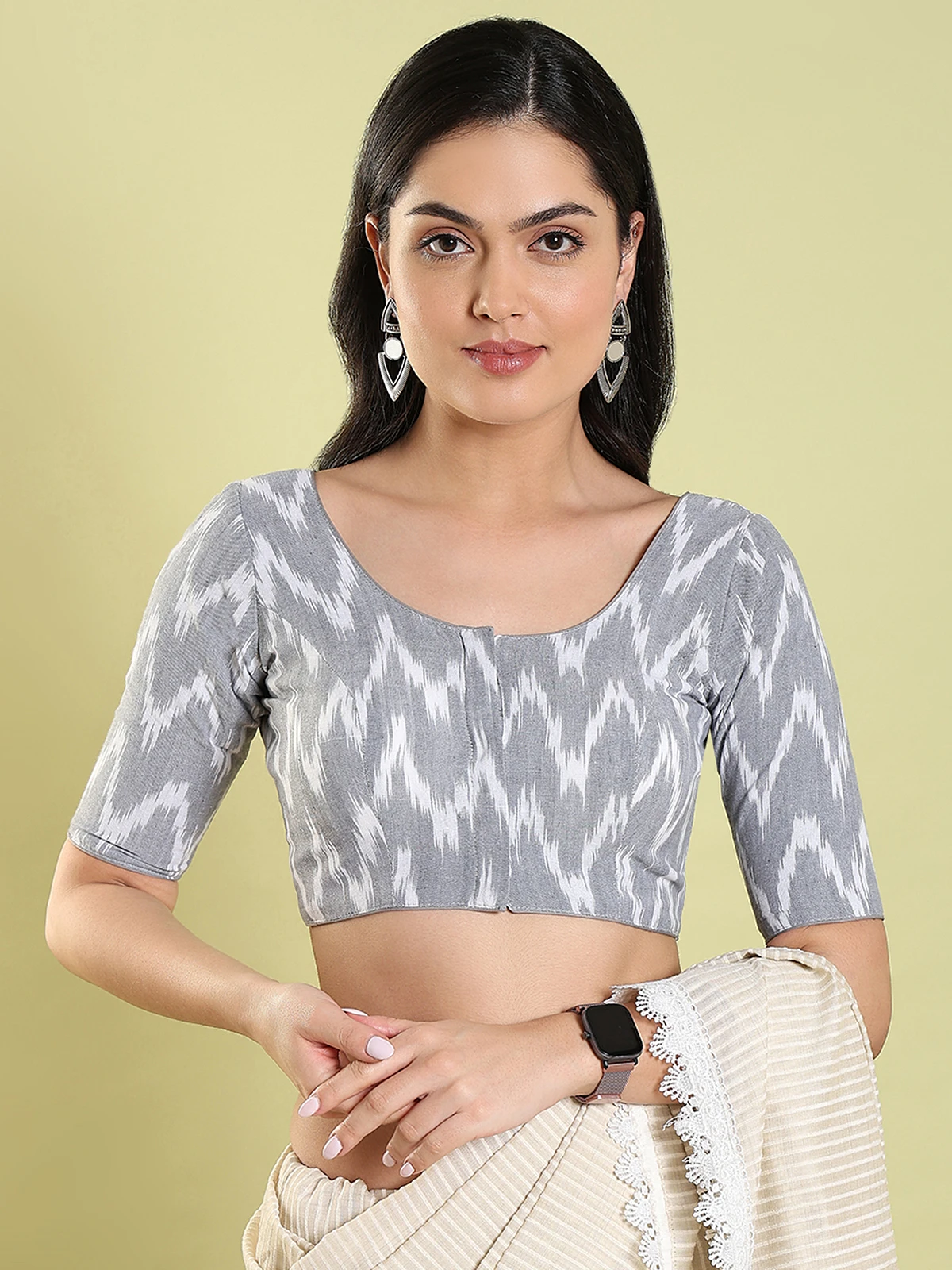 Add a special touch to your wardrobe with this grey ikat printed blouse. This versatile cotton blouse comes with elbow sleeves and a round neck.
