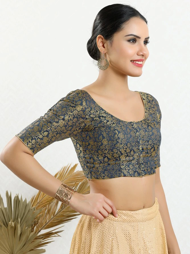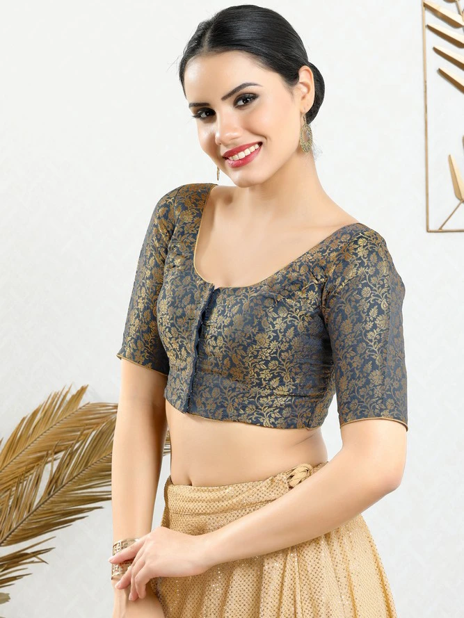 This grey jacquard fabric zari weaved ready made blouse. It has a round neckline, elbow sleeves and front open closure.