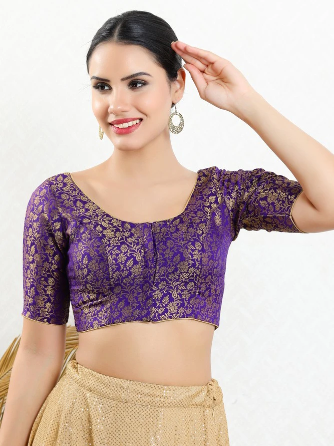 Add this purple color jacquard fabric ready made blouse. Embellished with zari work at all over. It features with a round neckline, elbow sleeves and front open closure.