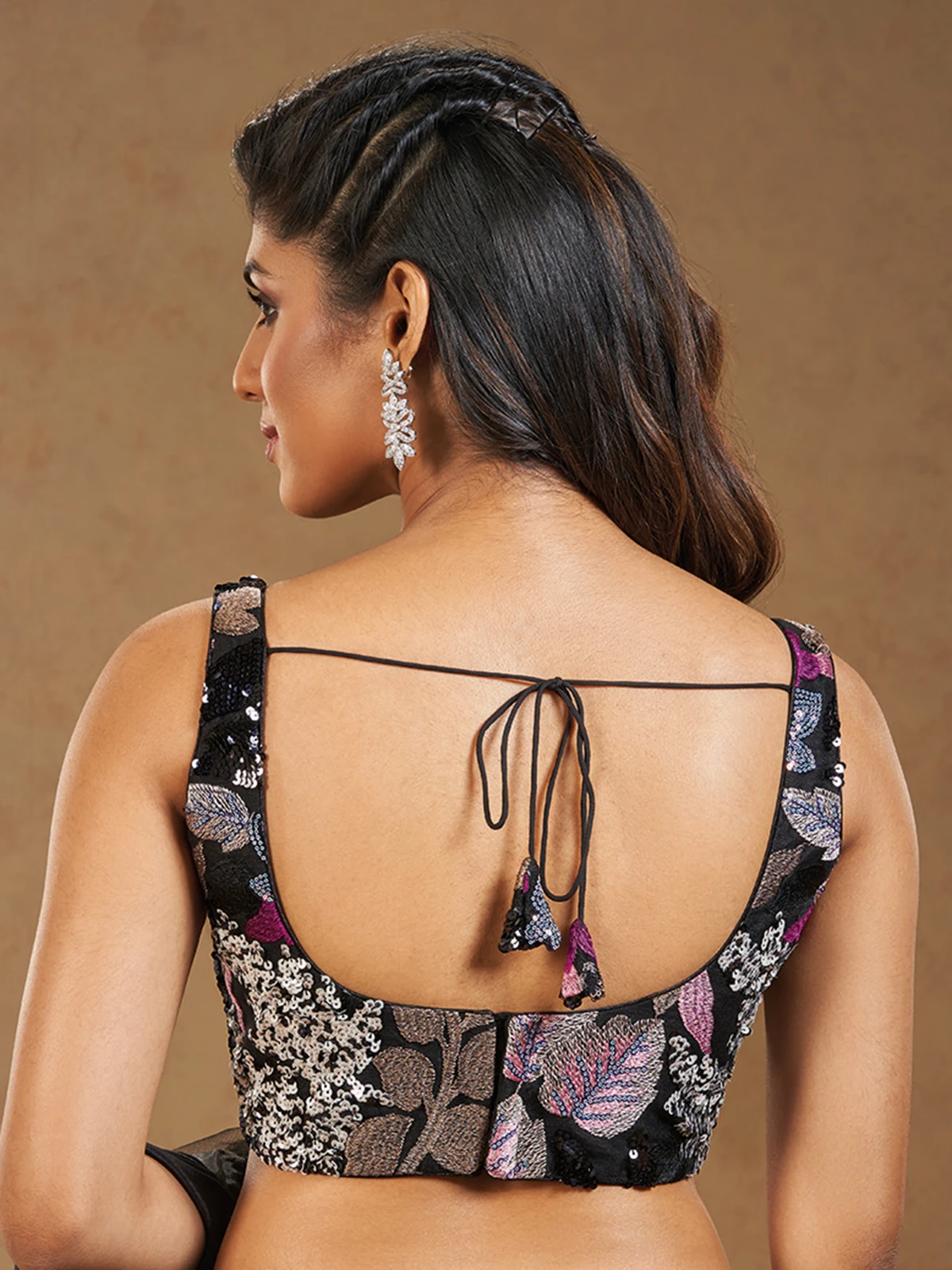 Keep your style fashionable with this black polyester ready made blouse. Embellished with embroidery and sequins work, it has sleeveless pattern and back hook closure.