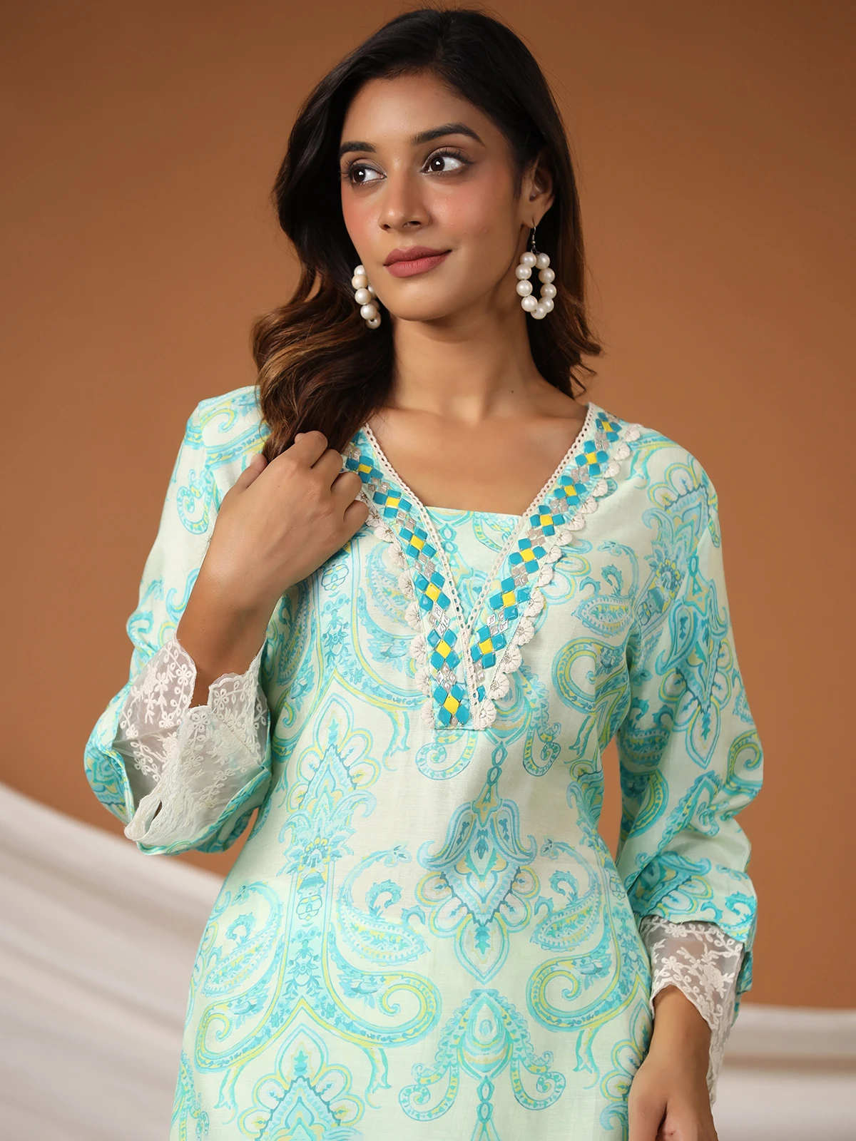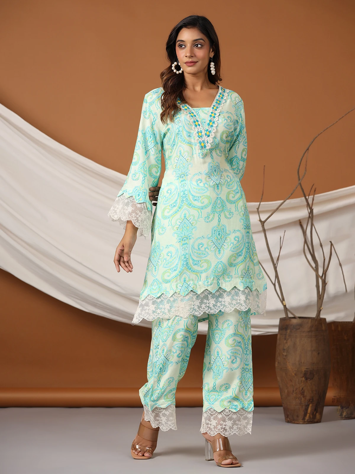 Crafted from cotton for ultimate comfort, this sea green printed co ord set for day wear. It has a quarter sleeves for a touch of elegance.
