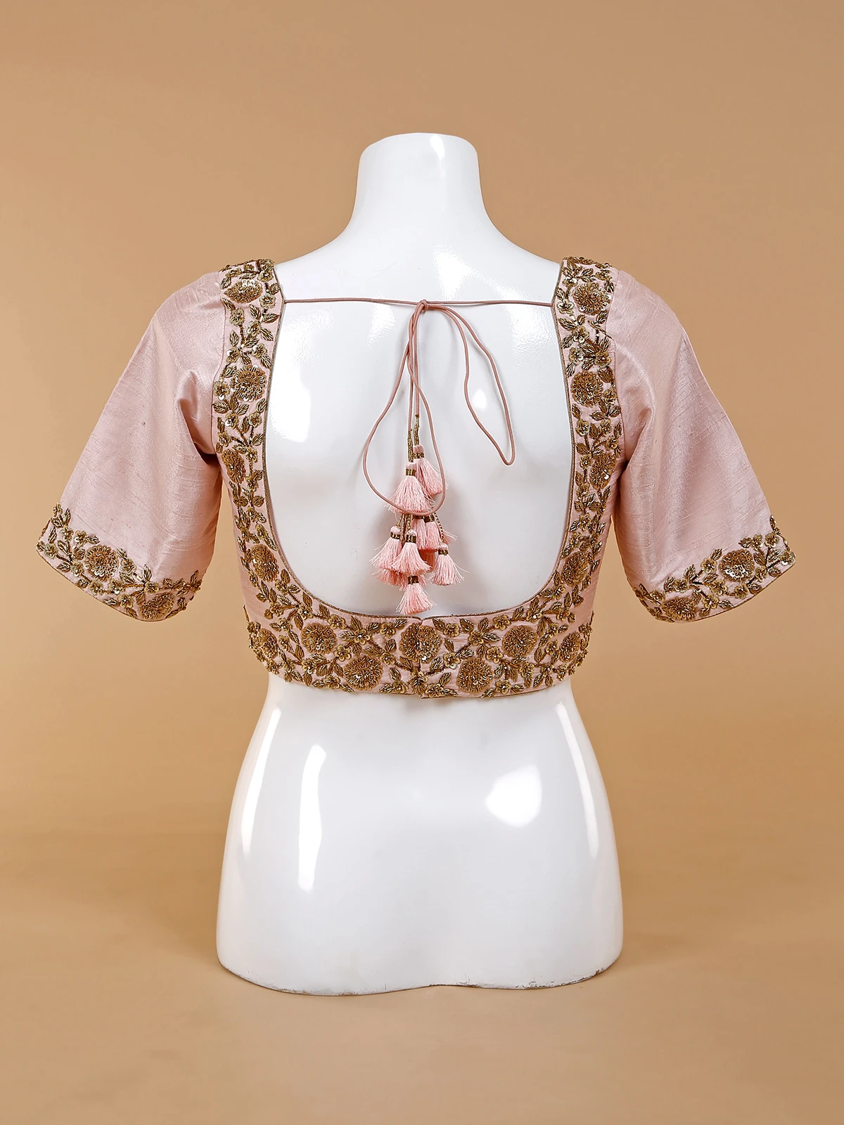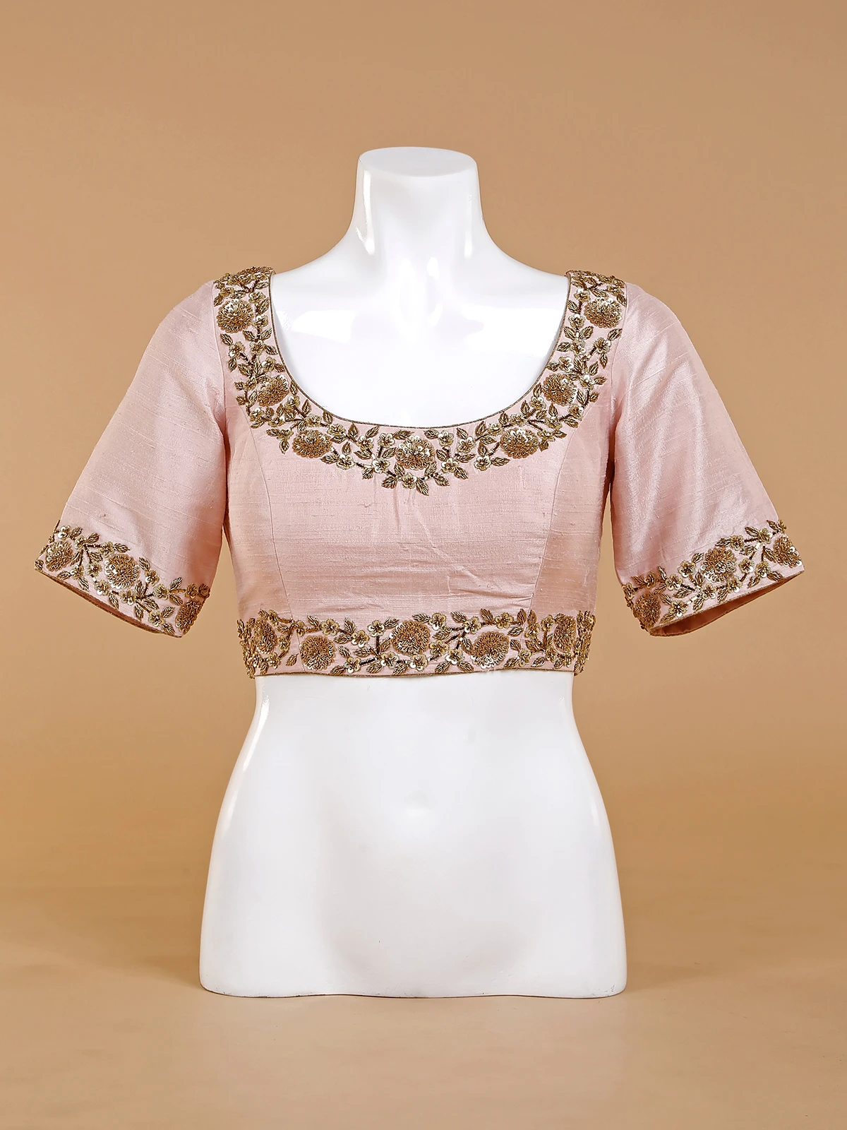 Amp up your ethnic ensemble with this light pink blouse. Crafted in silk, this blouse enhanced with zardosi and sequins work, has a round neck and half sleeves.