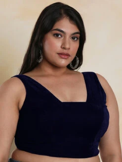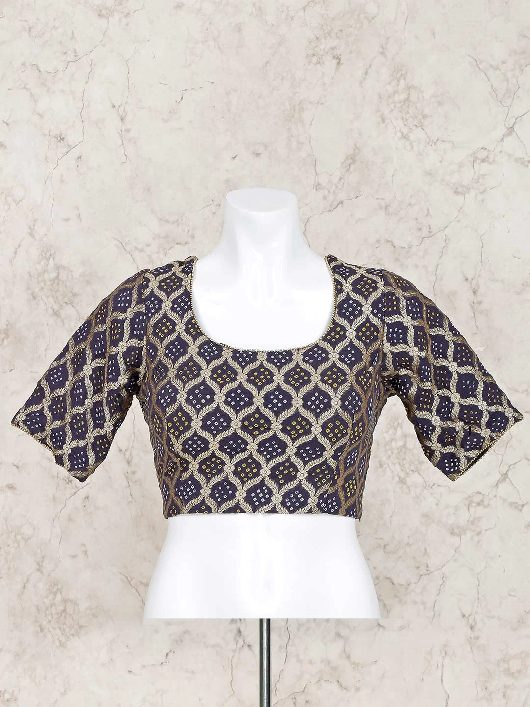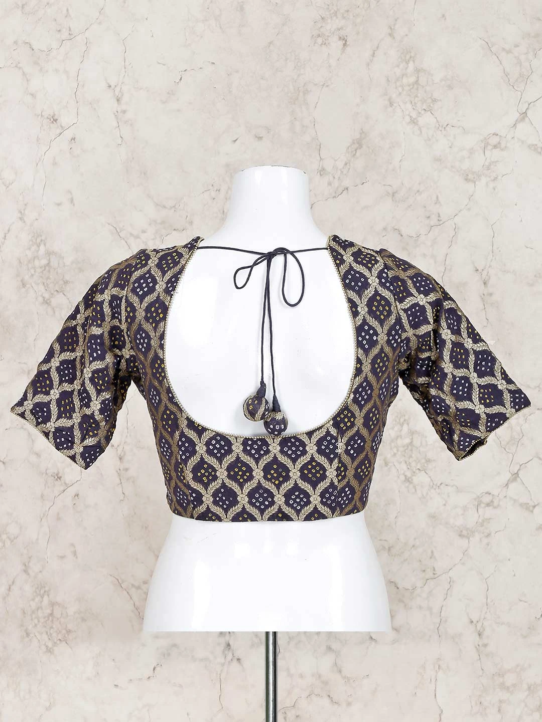 This navy printed ready made blouse will certainly gives you a dazzling look when adorned with designer saree, decorated with attractive zari weaving. It has a side opening zipper with back on side tie up string with fancy tassel.