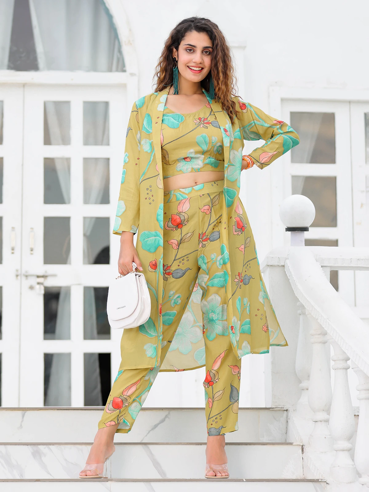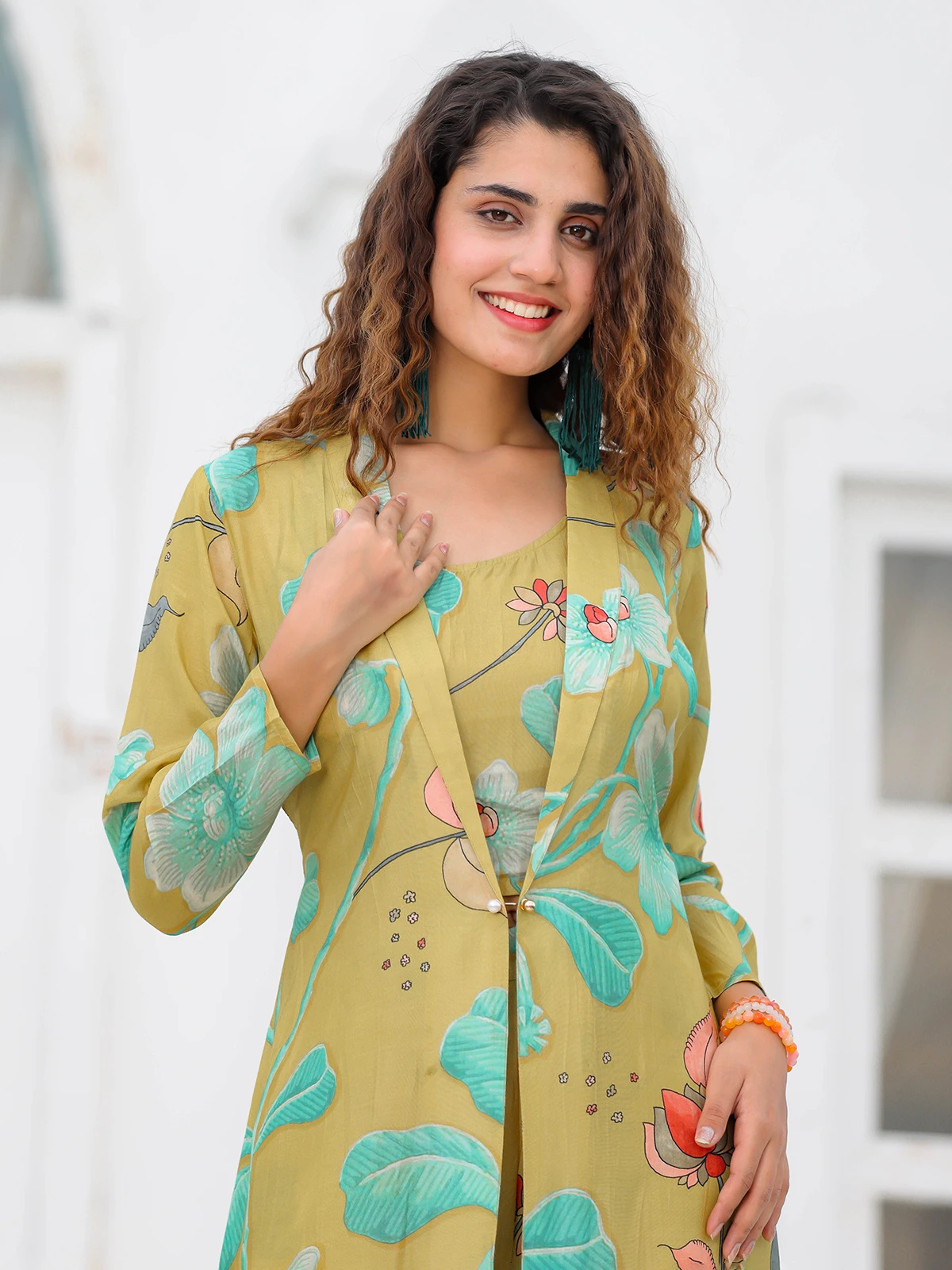 A great combination of comfort and style, this olive cotton printed co ord set with shrug can be a versatile addition to your wardrobe. The shawl lapel collar and quarter sleeves will surely make you look gorgeous.