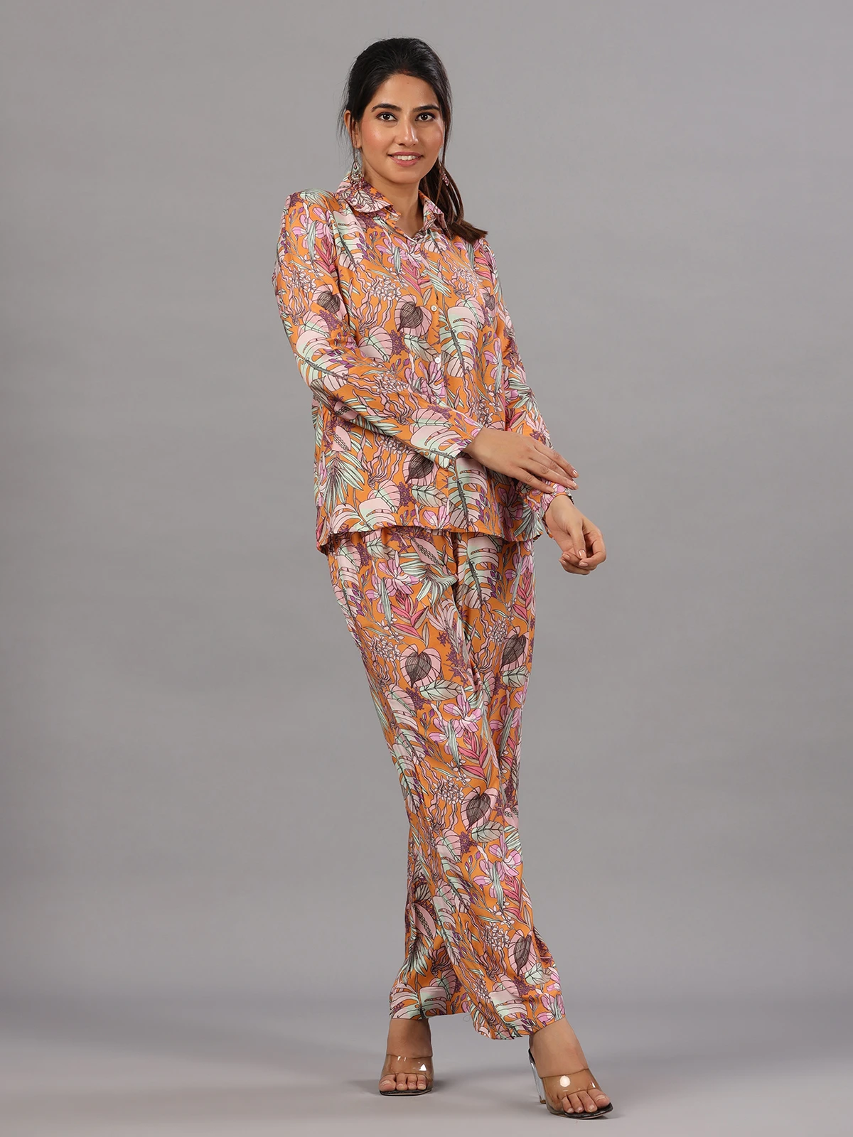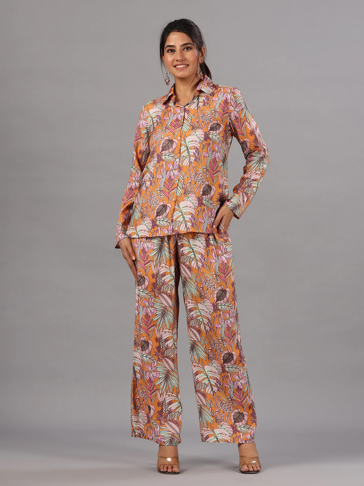 Effortlessly cool, this orange silk printed co ord set is designed with collar neck and full sleeves to elevate your casual wardrobe like no other.