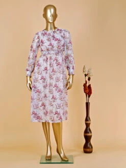Exclusively designed for women, this pink floral printed dress from Pink Nine is crafted in georgette fabric. It has a V neck and quarter sleeves for comfort versatile and perfect for all day wear.