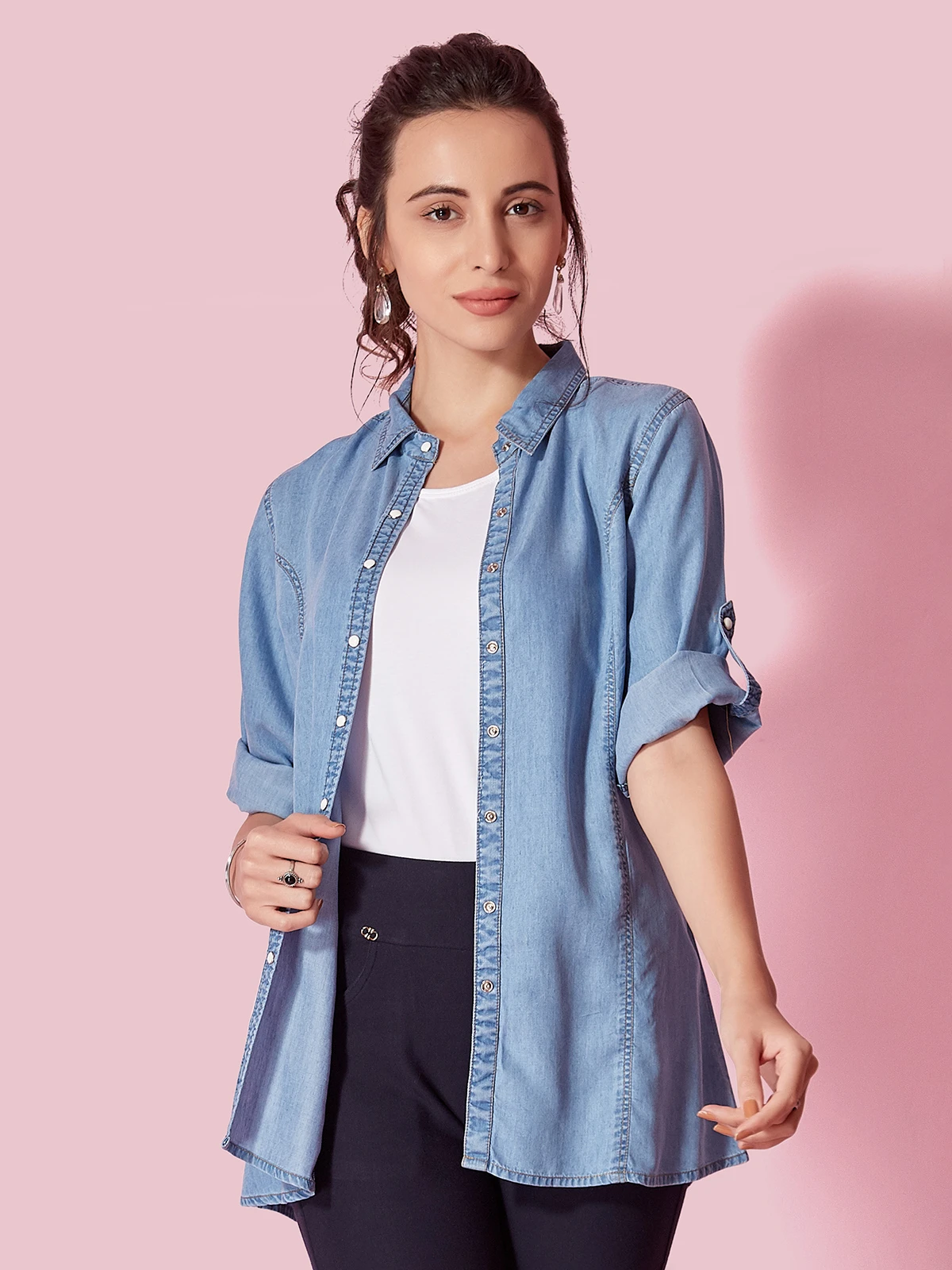 Crafted to keep you warm, this Pink Nine light blue plain denim shirt is super likeable. Create a chic look for your next date with collar neck and full sleeves.