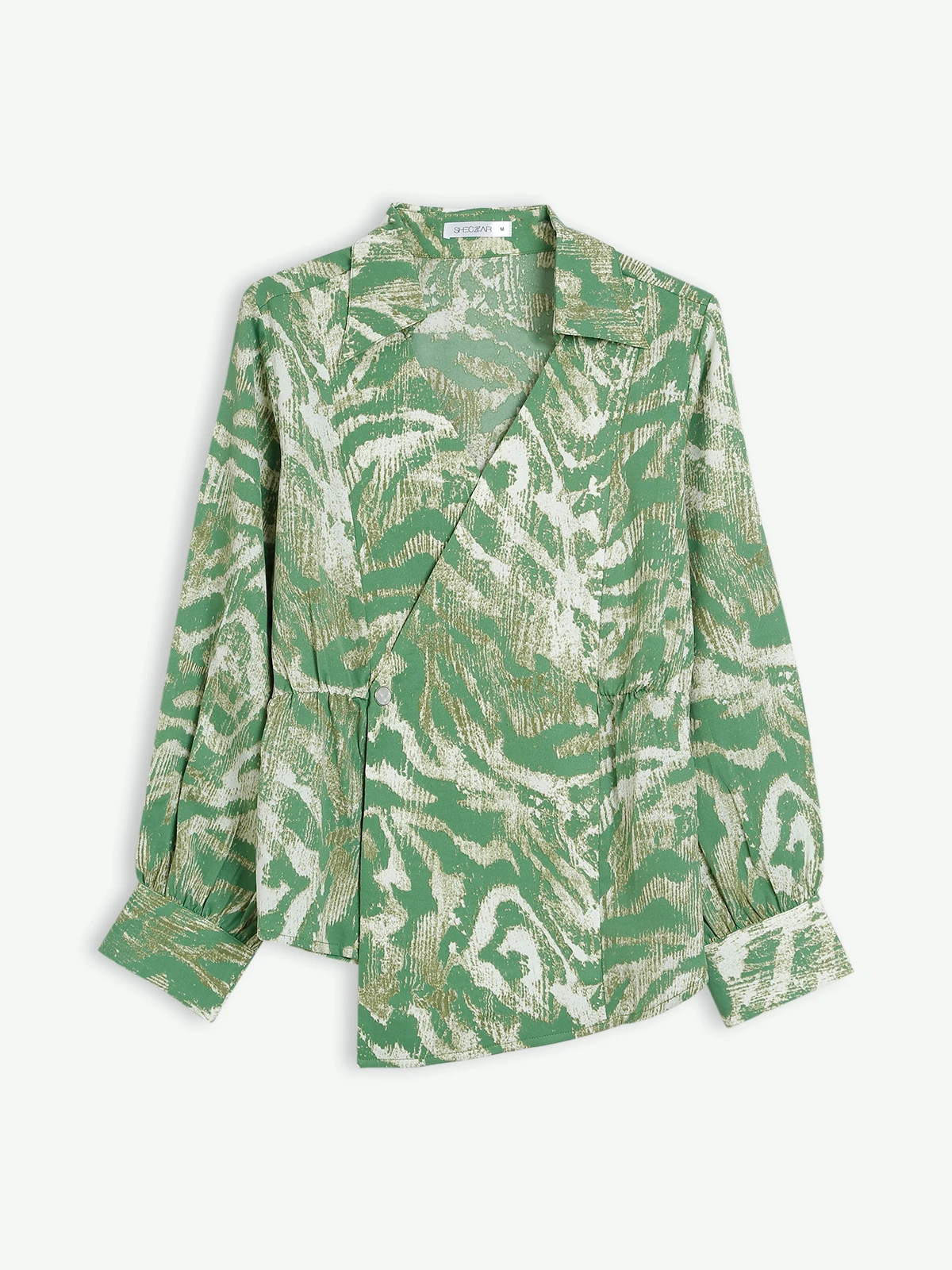 This statement green polyester full sleeves printed top is for the fashion experimentalist out there.