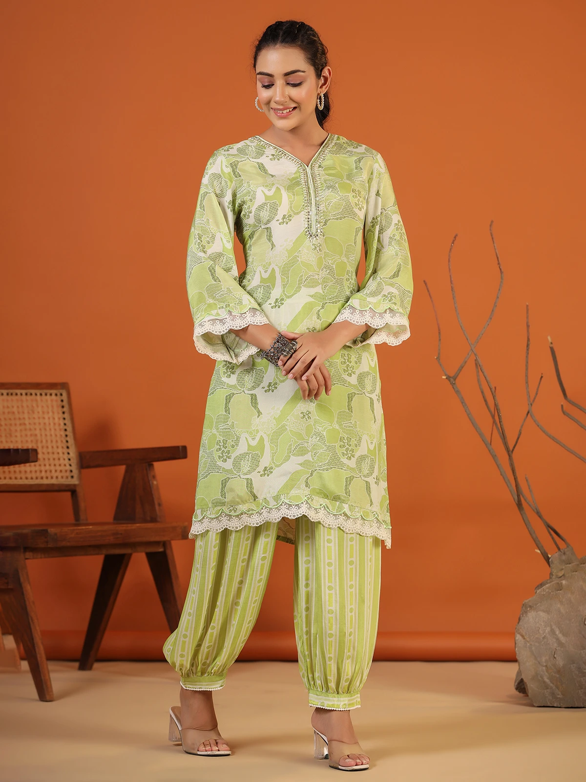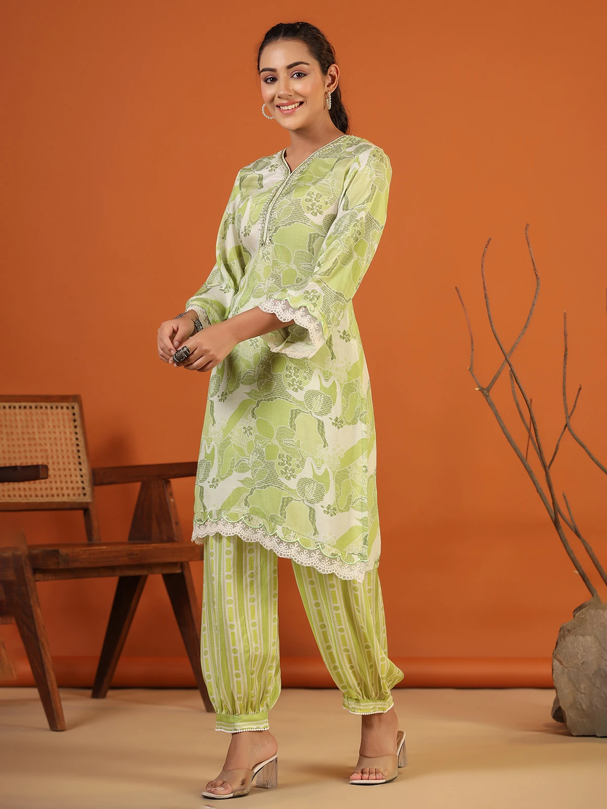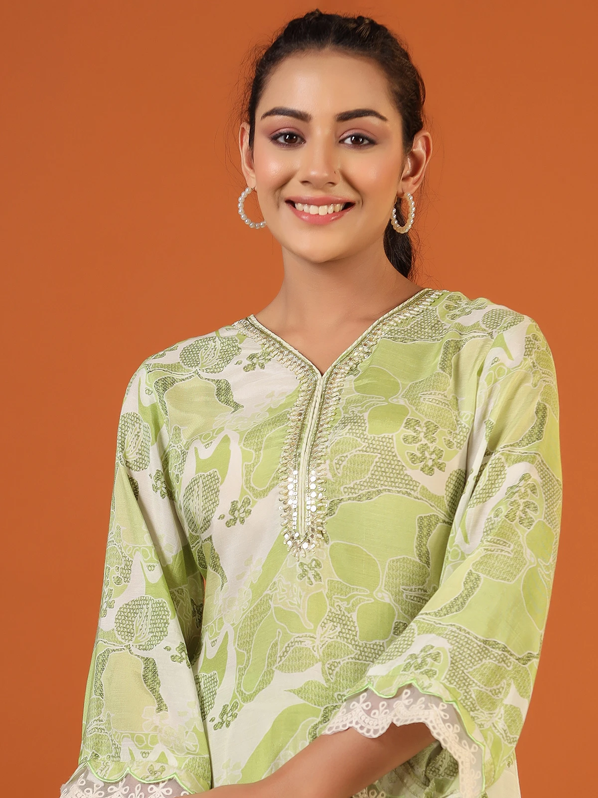 Classic sage green printed co ord set, made from comfortable silk for all day wear. It has a mirror, sequins and beads work around the neckline, features a V neck and quarter sleeves for a fashionable look.