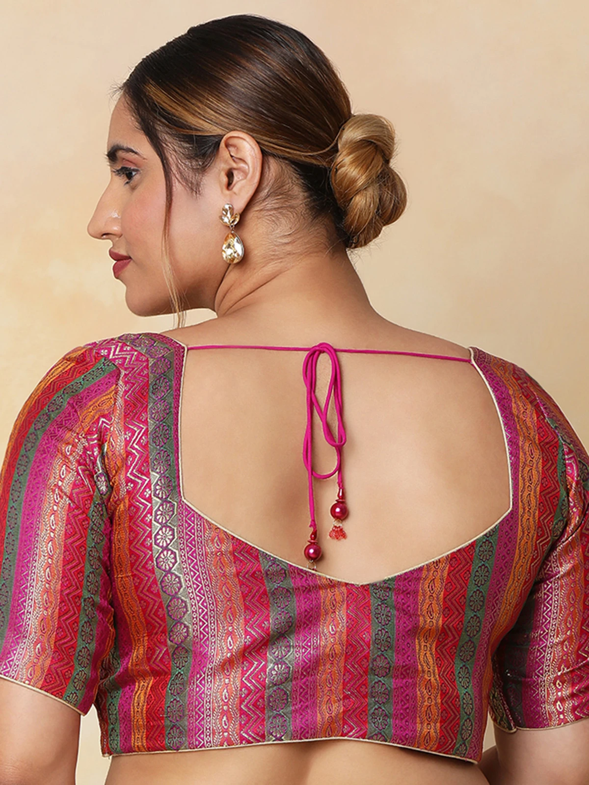 This purple brocade blouse is design with amazing zari weaving. Features a front hook closure and elbow sleeves.