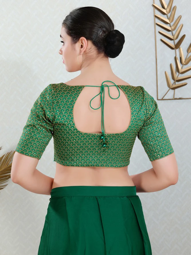 Make your classy personality more charming by wearing this rama green ready made art silk blouse. Prettify with zari work all over. Featuring with a round neckline, elbow sleeves and front open closure.