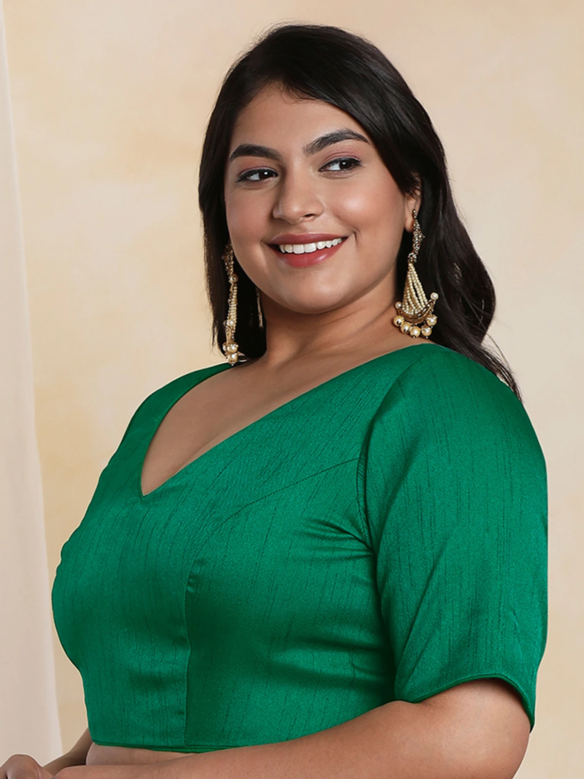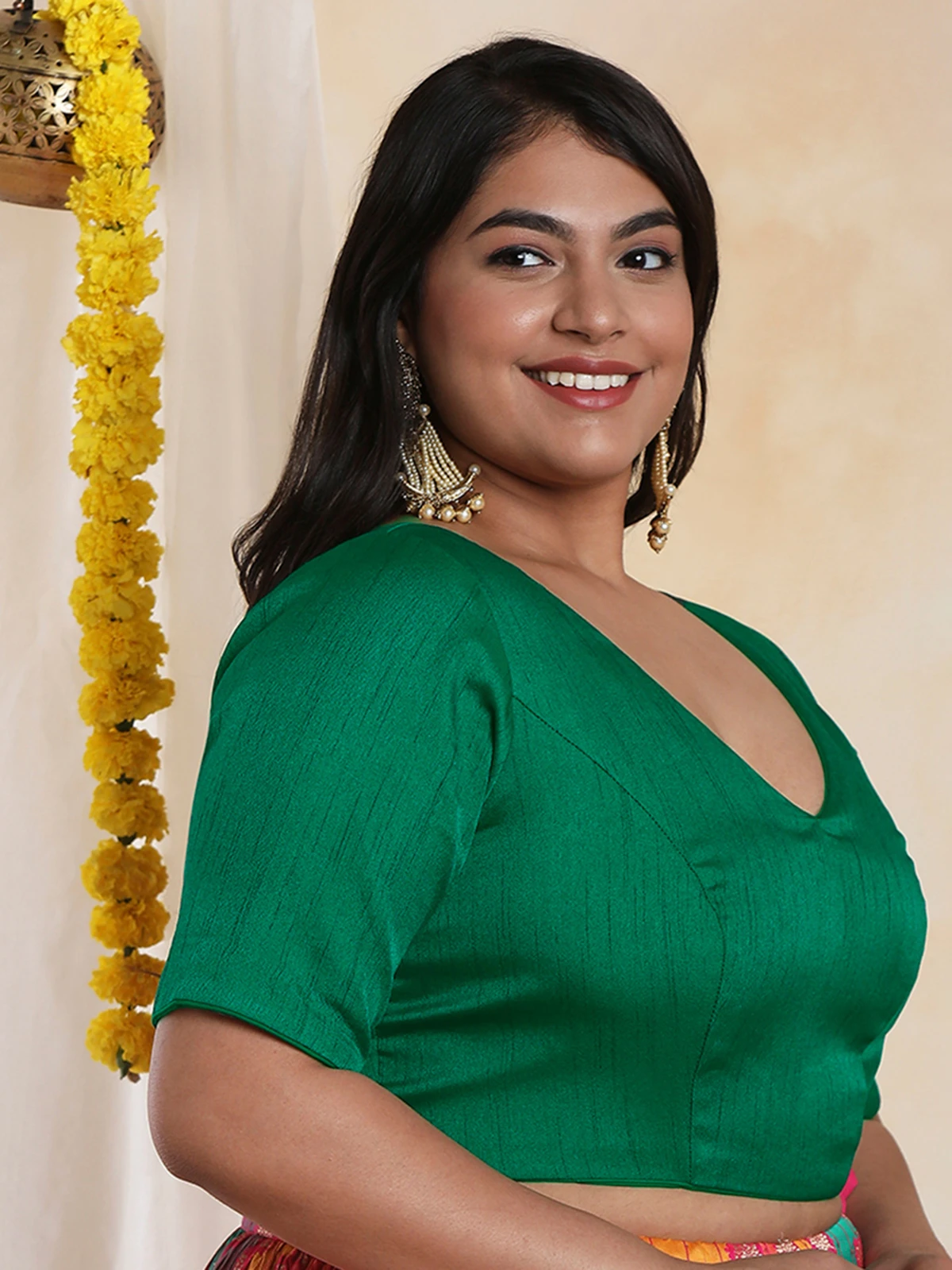 This plain green ready made blouse in raw silk fabric. It features a classy V neck, back hook closure and elbow length sleeves.
