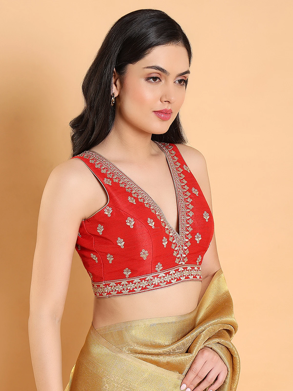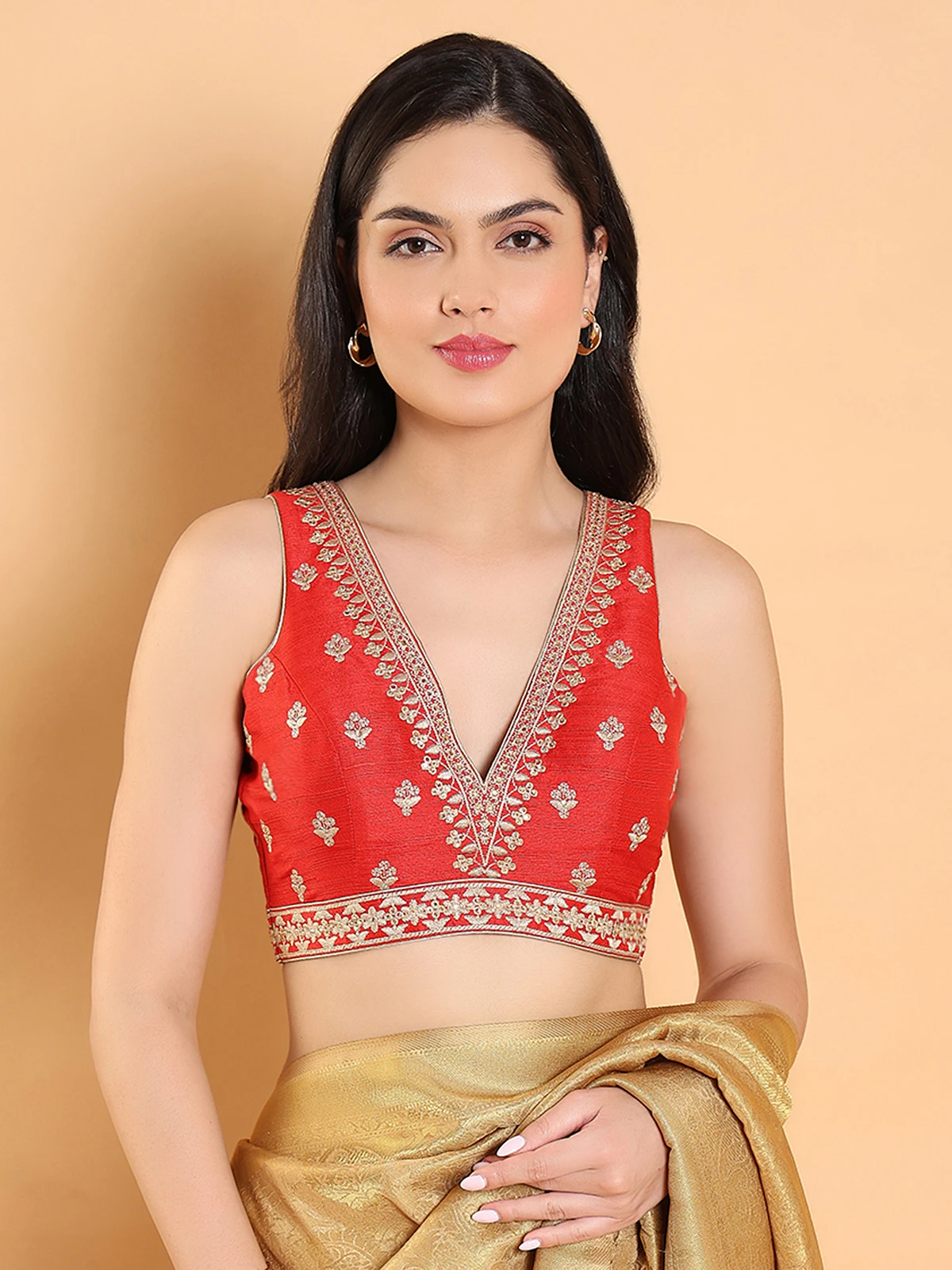 Easy to style and comfortable to wear, this red silk blouse with embroidery work, comes with a V neck and sleeveless pattern.