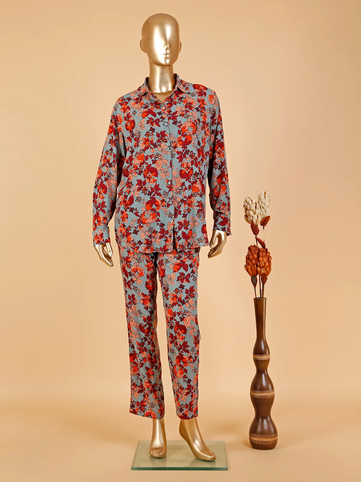 Embrace a contemporary and graceful look with this grey cotton leaf printed co ord set from Sheczzar. The collar neck and full sleeves add to its charm.