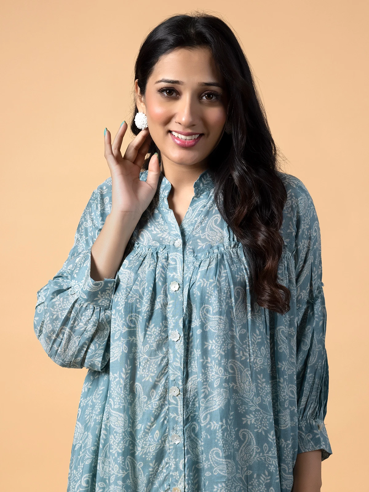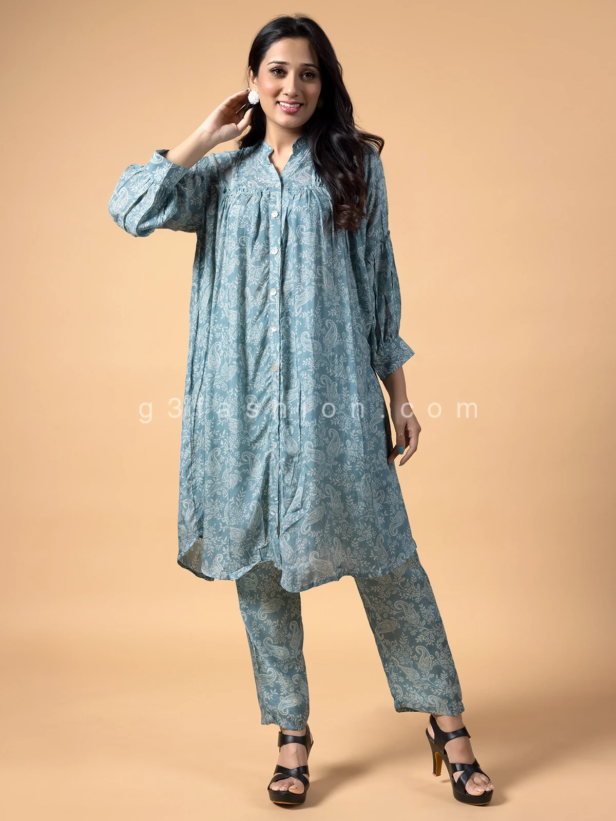 This stone blue crepe co ord set for casual. Enhanced with nice print, features a stand collar neck and full sleeves. Comes with a bottom.