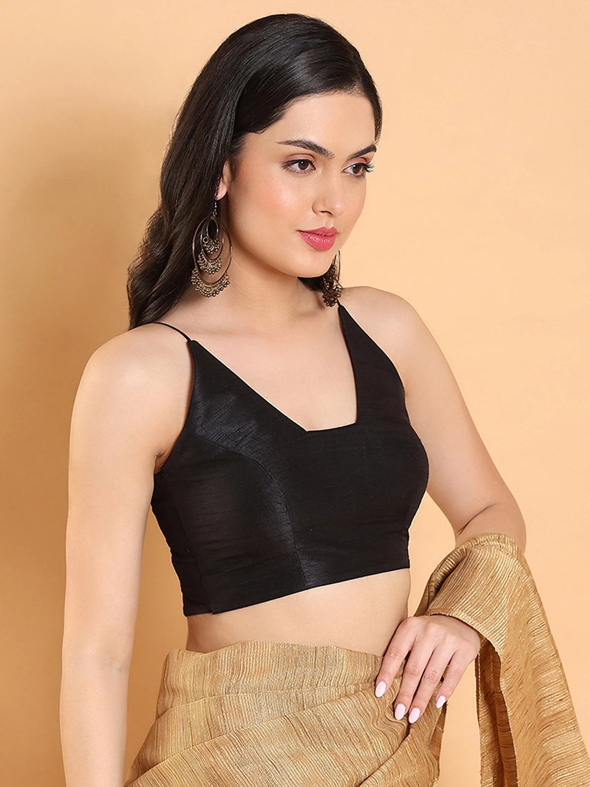 The trendy and versatile black plain blouse made from silk material, this blouse features sleeveless pattern and back open closure.