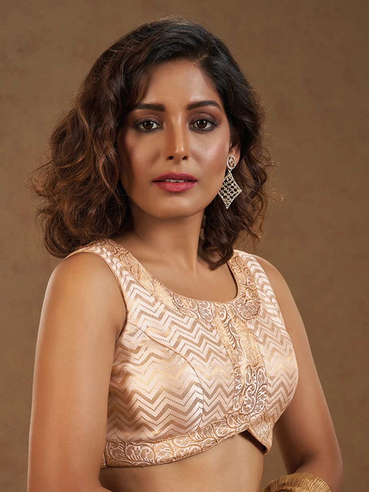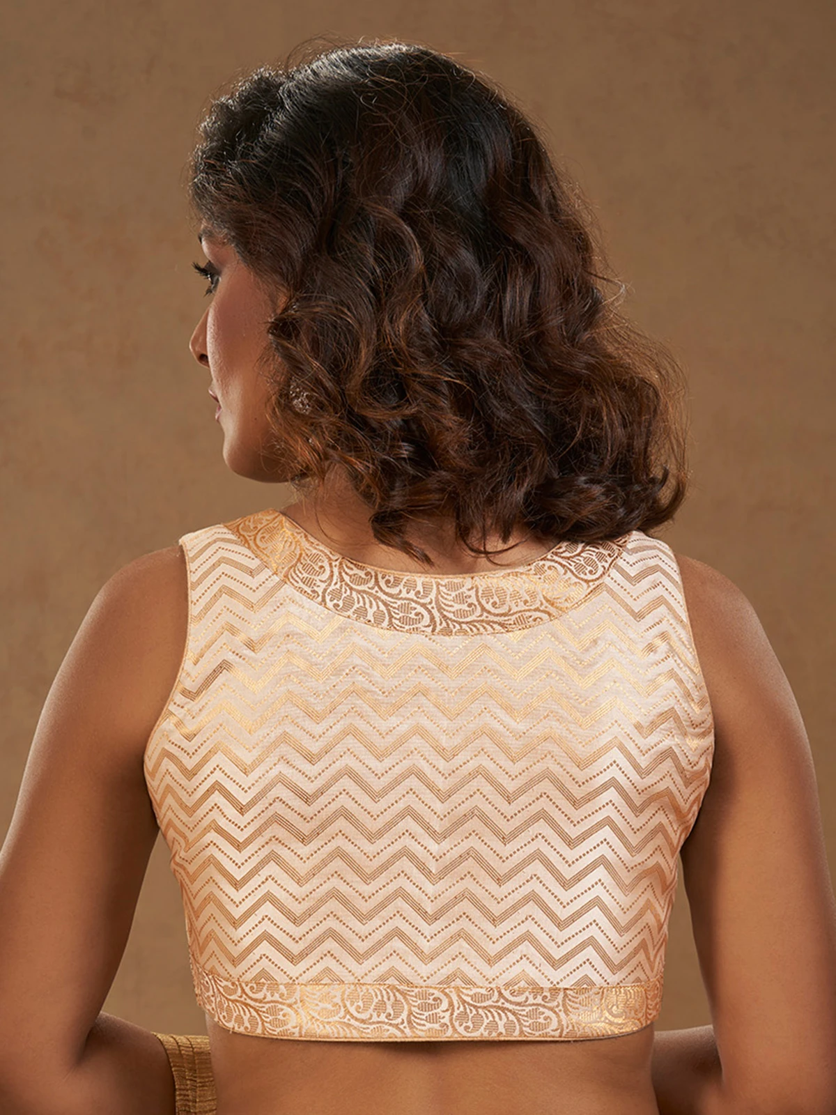 This charming cream zari weaving brocade blouse will surely fetch you compliments for your rich sense of style. Features a U neck and sleeveless pattern.